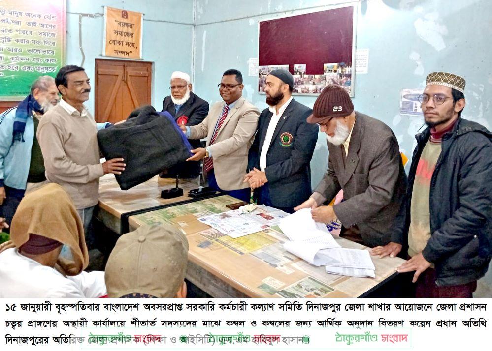 ১৫ জানুয়ারী বৃহস্পতিবার বাংলাদেশ অবসরপ্রাপ্ত সরকারি কর্মচারী কল্যাণ সমিতি দিনাজপুর জেলা শাখার আয়োজনে জেলা প্রশাসন চত্বর প্রাঙ্গণের অস্থায়ী কার্যালয়ে শীতার্ত সদস্যদের মাঝে কম্বল ও কম্বলের জন্য আর্থিক অনুদান বিতরণ অনুষ্ঠানে তিনি প্রধান অতিথির বক্তব্যে এ কথাগুলো বলেন। স্বাগত বক্তব্য রাখেন বাংলাদেশ অবসরপ্রাপ্ত সরকারি কর্মচারী কল্যাণ সমিতি দিনাজপুর জেলা শাখার সাধারন সম্পাদক প্রকৌঃ আমজাদ হোসেন। বিশেষ অতিথি হিসেবে বক্তব্য রাখেন জেলা ক্রীড়া অফিসার মোঃ আসাদুজ্জামান ও সমিতির সাবেক চেয়ারম্যান মোঃ মোকাররম হোসেন। সঞ্চালকের দায়িত্ব পালন করেন সমিতির কোষাধ্যক্ষ মোঃ ফসিউদ্দিন আহমেদ। সার্বিক তত্ত্বাবধানে ছিলেন সমিতির কম্পিউটার অপারেটর মোঃ হাসনাত রহমান। প্রধান অতিথি ১৩৮ জনের মাঝে কম্বল ক্রয়ের জন্য ৫০০ টাকা করে ৬৯ হাজার টাকা ও ১৫০ জনের মাঝে কম্বল বিতরণ করেন প্রধান অতিথি দিনাজপুরের অতিরিক্ত জেলা প্রশাসক (শিক্ষা ও আইসিটি) এস.এম হাবিবুল হাসান।