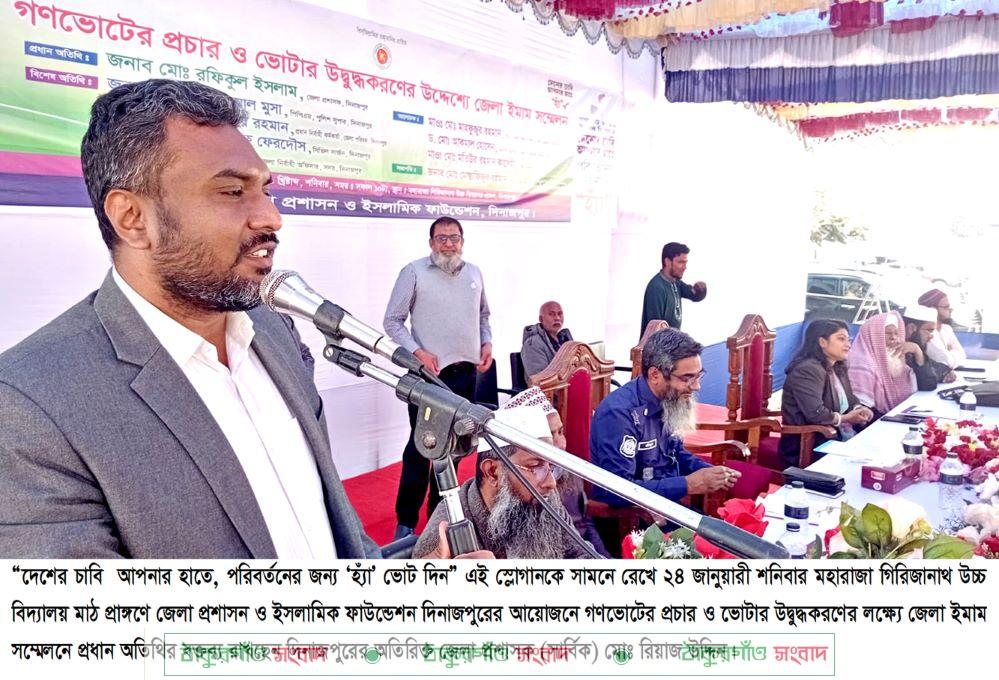 দেশের চাবি আপনার হাতে, পরিবর্তনের জন্য ‘হ্যাঁ’ ভোট দিন” এই স্লোগানকে সামনে রেখে ২৪ জানুয়ারী শনিবার মহারাজা গিরিজানাথ উচ্চ বিদ্যালয় মাঠ প্রাঙ্গণে জেলা প্রশাসন ও ইসলামিক ফাউন্ডেশন দিনাজপুরের আয়োজনে গণভোটের প্রচার ও ভোটার উদ্বুদ্ধকরণের লক্ষ্যে জেলা ইমাম সম্মেলন অনুষ্ঠিত হয়েছে।