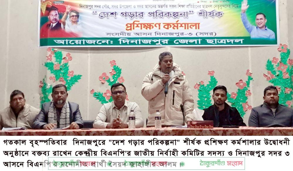 বৃহস্পতিবার দিনাজপুরে “দেশ গড়ার পরিকল্পনা” শীর্ষক প্রশিক্ষণ কর্মশালা অনুষ্ঠিত হয়েছে। প্রশিক্ষণ কর্মশালার উদ্বোধন করেন, কেন্দ্রীয় বিএনপি’র জাতীয় নির্বাহী কমিটির সদস্য ও দিনাজপুর সদর ৩ আসনে বিএনপি’র মনোনীত প্রার্থী সৈয়দ জাহাঙ্গীর আলম। প্রধান আলোচক ছিলেন, কেন্দ্রীয় ছাত্রদলের যুগ্ন সাধারন সম্পাদক মো: রিসালাত ইসলাম সজীব। দিনাজপুর জেলা ছাত্রদল আয়োজিত উদ্বোধনী অনুষ্ঠানে এক সংক্ষিপ্ত বক্তব্যে সৈয়দ জাহাঙ্গীর আলম বিএনপির ভারপ্রাপ্ত চেয়ারম্যান তারেক রহমানের দেশ গড়ার পরিকল্পনার চিন্তা-চেতনাকে জনগণের দ্বারে দ্বারে পৌঁছে দেয়ার আহবান জানিয়ে বলেন,ছাত্রদের নৈতিকভাবে সৎ থাকতে হবে। ছাত্ররাই পারে সুন্দর, সমাজ ও জাতি গঠন করতে। তিনি শহীদ রাষ্ট্রপতি জিয়াউর রহমান ও দেশনেত্রী বেগম খালেদা জিয়ার স্বপ্ন এবং তারুণ্যের অহংকার তারেক রহমানের দেশ গড়ার পরিকল্পনাকে বাস্তবায়ন করতে ছাত্রদের দায়িত্ব হল জনগণকে উদ্বুদ্ধ করে ভোটের অধিকার নিশ্চিত করা। প্রধান আলোচক কেন্দ্রীয় ছাত্রদলের যুগ্ম সাধারণ সম্পাদক মোঃ রিসালাত ইসলাম সজীব বলেন, বিগত ১৬ বছর ভোটের অধিকার থেকে জনগণকে বঞ্চিত করা হয়েছিল। ভোটের অধিকার ফিরিয়ে আনতে অপেক্ষা করছে ১২ ফেব্রæয়ারি, এ দিন থেকেই গণতন্ত্রের যাত্রা শুরু করবে। গণতন্ত্রের এ যাত্রায় সাধারণ শিক্ষার্থীদের অংশীদার করে নতুন বাংলাদেশ বিনির্মাণ করব তারেক রহমানের নেতৃত্বে আজকের প্রশিক্ষণ কর্মশালায় এই হবে শপথ। দিনাজপুর জেলা ছাত্রদলের সভাপতি রুবেল ইসলামের সভাপতিত্বে ও সাধারণ সম্পাদক আবুজার সেতুর সঞ্চালনে অন্যান্যদের মধ্যে প্রশিক্ষণে বক্তব্য রাখেন,সহ আলোচক স্টেট ইউনিভার্সিটির ছাত্রদলের সাধারণ সম্পাদক মাহমুদুর রহমান আবির,দিনাজপুর মেডিকেল কলেজের আহবায়ক ডাক্তার নুরজামাল সরকার, জেলা ছাত্রদলের সহ-সভাপতি সাদিব ও নূরনবী ইসলাম শুভ, সাংগঠনিক সম্পাদক গোলাপ, ছাত্রদল নেতা জুয়েল প্রমুখ। কর্মশালায় সদর, পৌর,সদর উপজেলা এবং দিনাজপুর (সদর) ৩ আসনের সকল শিক্ষা প্রতিষ্ঠানের ছাত্রদল নেতৃবৃন্দদের নিয়ে দিনব্যাপী প্রশিক্ষণ কর্মশালা অনুষ্ঠিত হয়।