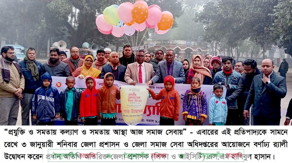 “প্রযুক্তি ও সমতায় কল্যাণ ও সমতায় আস্থা আজ সমাজ সেবায় ” – এবারের এই প্রতিপাদ্যকে সামনে রেখে ৩ জানুয়ারী শনিবার জেলা প্রশাসন ও জেলা সমাজ সেবা অধিদপ্তরের আয়োজনে বর্ণাঢ্য র্যালী, আলোচনাসভা ও সাংস্কৃতিক অনুষ্ঠান অনুষ্ঠিত হয়েছে।