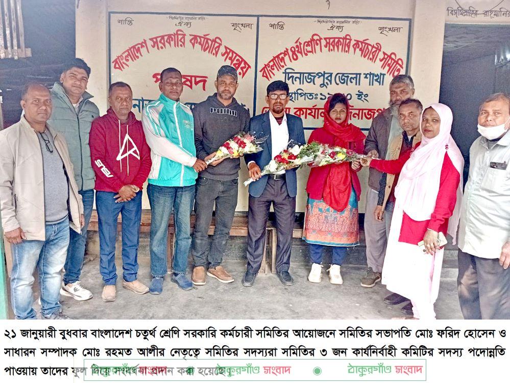 বুধবার বাংলাদেশ চতুর্থ শ্রেণি সরকারি কর্মচারী সমিতির আয়োজনে সমিতির সভাপতি মোঃ ফরিদ হোসেন ও সাধারন সম্পাদক মোঃ রহমত আলীর নেতৃত্বে সমিতির সদস্যরা সমিতির ৩ জন কার্যনির্বাহী কমিটির সদস্য পদোন্নতি পাওয়ায় তাদের ফুল দিয়ে সংবর্ধনা প্রদান করা হয়েছে।