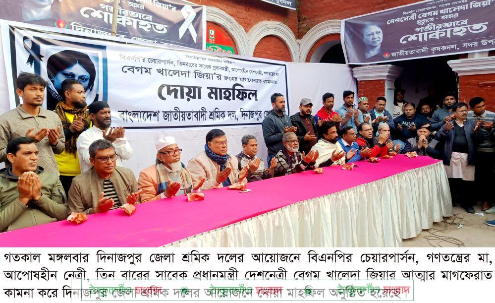 বিএনপির চেয়ারপার্সন, গণতন্ত্রের মা, আপোষহীন নেত্রী, তিন বারের সাবেক প্রধানমন্ত্রী দেশনেত্রী বেগম খালেদা জিয়ার আত্মার মাগফেরাত কামনা করে মঙ্গলবার শ্রমিক দলের দোয়া মাহফিল অনুষ্ঠিত হয়েছে। দোয়া মাহফিলে প্রধান অতিথি ছিলেন কেন্দ্রীয় বিএনপির নির্বাহী কমিটির সদস্য ও দিনাজপুর সদর-৩ আসনের সংসদ সদস্য প্রার্থী মোঃ জাহাঙ্গীর আলম।