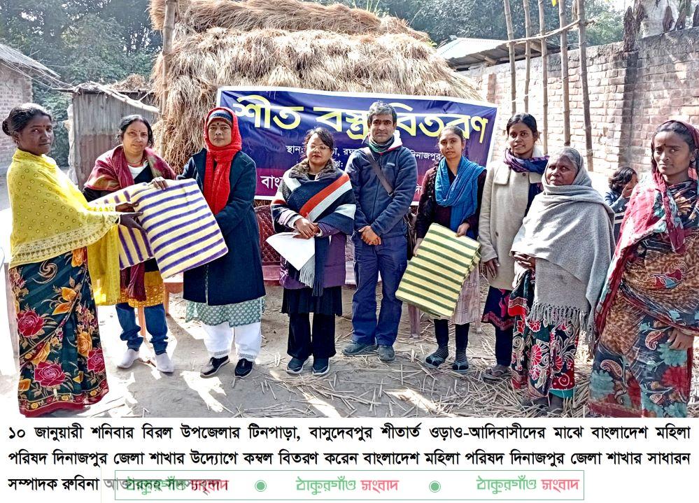 ১০ জানুয়ারী শনিবার বিরল উপজেলার টিনপাড়া, বাসুদেবপুর শীতার্ত ওড়াও-আদিবাসীদের মাঝে বাংলাদেশ মহিলা পরিষদ দিনাজপুর জেলা শাখার উদ্যোগে কম্বল বিতরণ করা হয়েছে।