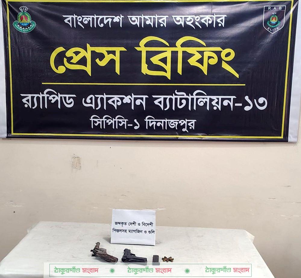রবিবার দুপুরে প্রেসবিজ্ঞপ্তিতে দিনাজপুর র্যাব-১৩ এর অধিনায়ক অতিরিক্ত পুলিশ সুপার বিপ্লব কুমার গোস্বামী জানান, অবৈধ অস্ত্র ও গোলাবারুদ উদ্ধারে র্যাব নিয়মিতভাবে গোয়েন্দা নজরদারি, তথ্য সংগ্রহ এবং অভিযান পরিচালনা করে আসছে। এরই ধারাবাহিকতায় গোপন সংবাদের ভিত্তিতে র্যাব-১৩ এর সিপিসি-১, দিনাজপুর ক্যাম্পের একটি দল এই অভিযান পরিচালনা করেন। অভিযানকালে সদরের চেহেলগাজী ইউনিয়নের উত্তর গোবিন্দপুর এলাকায় অবস্থিত মাধ্যমিক ও উচ্চ মাধ্যমিক শিক্ষা বোর্ড, দিনাজপুরের প্রধান ফটকের সামনে পাকা রাস্তার পশ্চিম পাশে পরিত্যক্ত অবস্থায় বাজারের একটি ব্যাগ থেকে একটি অবৈধ বিদেশি পিস্তল, একটি দেশীয় ওয়ান শুটার গান, একটি ম্যাগাজিন এবং ৭ রাউন্ড তাজা গুলি উদ্ধার করা হয়। উদ্ধারকৃত অস্ত্র ও জব্দকৃত আলামত পরবর্তী আইনগত ব্যবস্থা গ্রহণের জন্য সংশ্লিষ্ট থানায় হস্তান্তর করা হয়েছে।