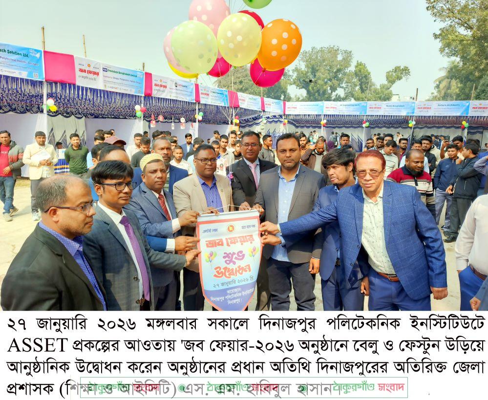 একটাই লক্ষ্য হতে হবে দক্ষ, কারিগরি দক্ষতায় সমৃদ্ধি’—এই স্লোগানকে সামনে রেখে দিনাজপুর পলিটেকনিক ইনস্টিটিউটে উৎসবমুখর পরিবেশে অনুষ্ঠিত হয়েছে ‘জব ফেয়ার-২০২৬’।