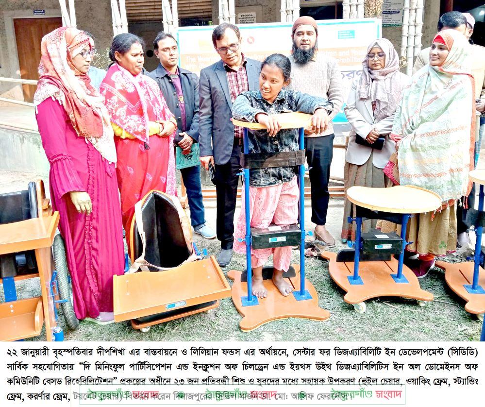 বৃহস্পতিবার দীপশিখা এর বাস্তবায়নে ও লিলিয়ান ফন্ডস এর অর্থায়নে, সেন্টার ফর ডিজএ্যাবিলিটি ইন ডেভেলপমেন্ট (সিডিডি) সার্বিক সহযোগিতায় ”দি মিনিংফুল পার্টিসিপেশন এন্ড ইনক্লুশন অফ চিলড্রেন এন্ড ইয়থস উইথ ডিজএ্যাবিলিটিস ইন অল ডোমেইনস অফ কমিউনিটি বেসড রিহেবিলিটেশন” প্রকল্পের অধীনে সিভিল সার্জন দিনাজপুর ডা. মো: আসিফ ফেরদৌস এর সভাপতিত্বে ২৩ জন প্রতিবন্ধী শিশু ও যুবদের মধ্যে সহায়ক উপকরণ (হুইল চেয়ার, ওয়াকিং ফ্রেম, স্ট্যান্ডিং ফ্রেম, করর্ণার ফ্রেম, টয়লেট চেয়ার) বিতরন করা হয়।
