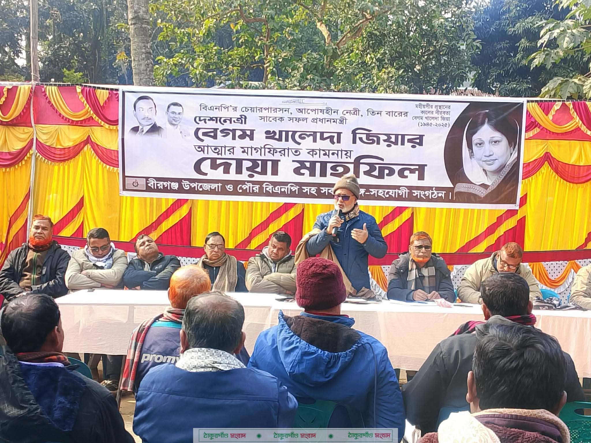 বাংলাদেশ জাতীয়তাবাদী দল (বিএনপি)’র চেয়ারপারসন ও সাবেক তিনবারের প্রধানমন্ত্রী দেশনেত্রী বেগম খালেদা জিয়ার মৃত্যুতে দলীয় কর্মসূচির অংশ হিসেবে দিনাজপুরের বীরগঞ্জ উপজেলা বিএনপি পৌর বিএনপি ও অঙ্গ-সহযোগী সংগঠনের উদ্যোগে দোয়া মাহফিল অনুষ্ঠিত হয়েছে।