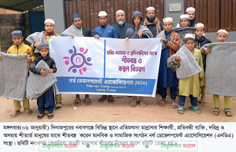 নবাবগঞ্জ(দিনাজপুর) প্রতিনিধিঃ দিনাজপুরের নবাবগঞ্জে বিভিন্ন স্থানে এতিমখানা মাদ্রাসার শিক্ষার্থী, প্রতিবন্ধী ব্যক্তি, দরিদ্র ও অসহায় শীতার্ত মানুষের মাঝে শীতবস্ত্র কম্বল বিতরণ করা হয়েছে। মঙ্গলবার(০৬ জানুয়ারী) মানবিক ও সামাজিক সংগঠন নর্থ ডেভেলপমেন্ট এ্যাসোসিয়েশন (এনডিএ) সংস্থার উদ্যোগে উপজেলার বিভিন্ন স্থানে গিয়ে সংস্থার সভাপতি আল আলিমুল রাজি শীতার্তদের মাঝে এ কম্বল তুলে দেন।
