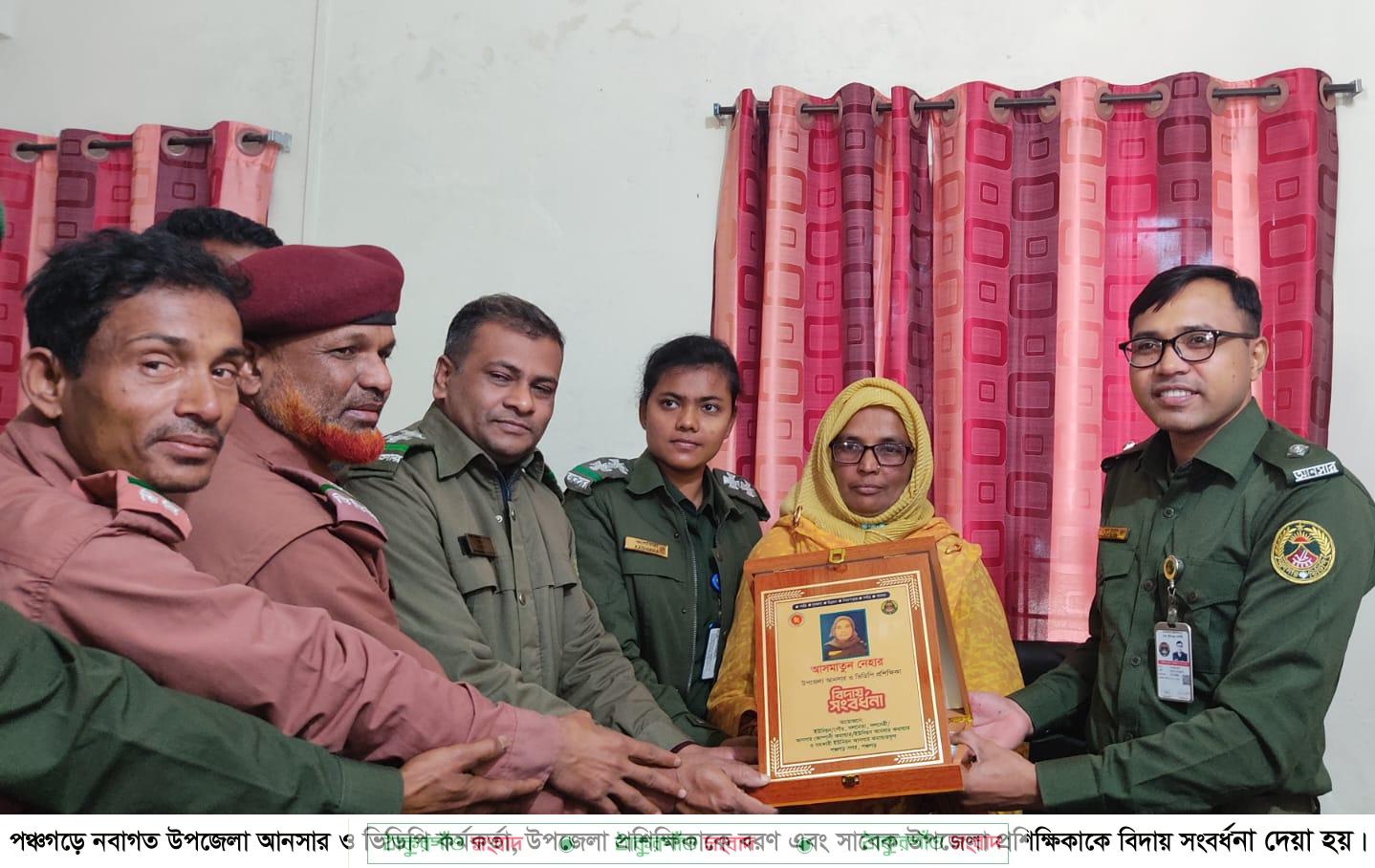 পঞ্চগড় সদর উপজেলায় নতুন আনসার ও ভিডিপি কর্মকর্তা মো. নুর আলম ও উপজেলা প্রশিক্ষিকা কাশমিরা আক্তারকে বরণ এবং সাবেক সদর উপজেলা প্রশিক্ষিকা আছমাতুন নেহারের বিদায় সংবর্ধনা অনুষ্ঠিত হয়েছে। গতকাল মঙ্গলবার দুপুরে উপজেলা আনসার ও ভিডিপি হলরুমে ওই সংবর্ধনা অনুষ্ঠানের আয়োজন করা হয়। সংবর্ধনা অনুষ্ঠানে নবাগত উপজেলা ও আনসার ভিভিপি কর্মকর্তা মো. নুর আলম, উপজেলা প্রশিক্ষিকা কাশমিরা আক্তার, বিদায়ী উপজেলা প্রশিক্ষিকা আছমাতুন নেহার ছাড়াও বক্তব্য দেন সদর উপজেলা প্রশিক্ষক শরিফুল ইসলাম, সদর উপজেলা কোম্পানী কমান্ডার রাশেদুল ইসলাম, সদর ইউনিয়নের লিডার শফিকুল ইসলাম প্রমূখ।