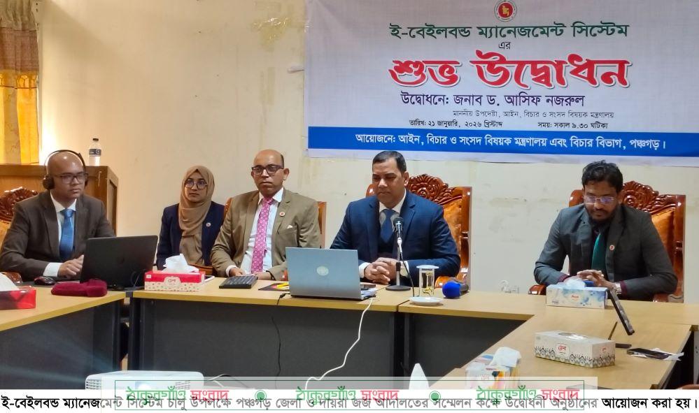 বিচার ব্যবস্থা আধুনিকায়ন ও বিচারপ্রার্থী জনগণের দুর্ভোগ লাঘবের লক্ষ্যে পঞ্চগড়সহ দেশের আট জেলায় একযোগে ই-বেইলবন্ড ম্যানেজমেন্ট সিস্টেম চালু করা হয়েছে। গতকাল বুধবার সচিবালয় প্রান্ত থেকে প্রধান অতিথি হিসেবে ভার্চ্যুয়ালি যুক্ত হয়ে আইন, বিচার ও সংসদ বিষয়ক মন্ত্রণালয়ের উপদেষ্টা ড. আসিফ নজরুল এ কার্যক্রমের উদ্বোধন করেন।