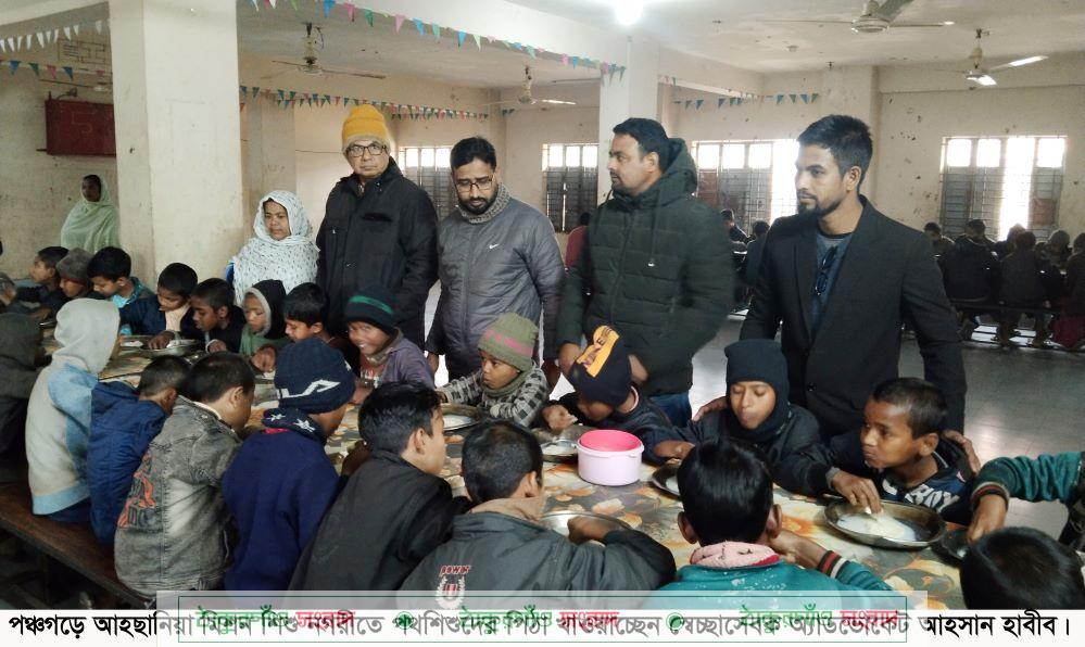 পঞ্চগড় জেলা সদরের হাফিজাবাদ ইউনিয়নের আহছানিয়া মিশন শিশু নগরী। এই শিশু নগরীতে স্থায়ী ঠিকানা হয়েছে সারাদেশের দেড় শতাধিক পথশিশুর। এখানকার অধিকাংশ শিশুরই নেই পরিচয়, নেই কোন ঠিকানা। সেখানের আলো বাতাসে বেড়ে উঠছে তারা। পড়ালেখা আর হেসে খেলে বড় হয়ে উঠছে তারা। দাতা সংস্থার অর্থ বন্ধ হয়ে যাওয়ায় টান পড়েছে তাদের খাবার-দাবাড়েও। ভালমন্দ খাওয়া এখন তাদের আর আগের মত হয়ে উঠে না। গতকাল শুক্রবার কুয়াশাভেজা সকালে এসকল পথশিশুর মূখে হাসি ফোটালেন গরিবের বন্ধু সম্মিলিত স্বেচ্ছাসেবী ফোরামের সমন্বয়ক অ্যাডভোকেট আহসান হাবীব সরকার। তিনি নিজ হাতে বাড়িতে তৈরী করে আনা দুধ পিঠা খাওয়ালেন এসব পথশিশুদের। পিঠা খেয়ে বেশ তৃপ্তির ঢেকুর তুলেছে তারা। আর সেখানকার সেন্টার ম্যানেজার বললেন, এভাবে বিত্তবানরা এগিয়ে এলে এ সকল পথশিশু সবসময় হাসিখুশি থাকবে সাধারণ শিশুদের মতই।