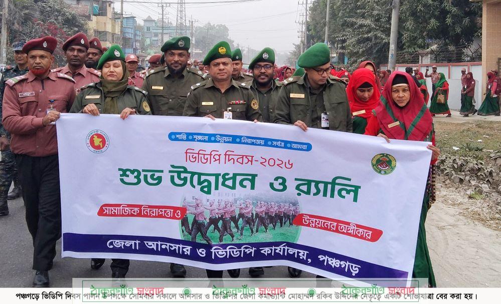 ‘সামাজিক নিরাপত্তা ও উন্নয়নের অঙ্গীকার’ এই প্রতিপাদ্যে পঞ্চগড়ে নানা আয়োজনে ভিডিপি প্রতিষ্ঠাবার্ষিকী উপলক্ষে ভিডিপি দিবস পালিত হয়েছে। গতকাল সোমবার সকালে পঞ্চগড় জেলা আনসার ও ভিডিপি কার্যালয়ের সামনে বেলুন উড়িয়ে দিবসের শুভ উদ্বোধন করেন জেলা কমান্ড্যান্ট মোহাম্মদ রকিব উদ্দিন। এ সময় সদর উপজেলা আনসার ও ভিডিপি কর্মকর্তা মো. নুর আলম, বোদা উপজেলা আনসার ও ভিডিপি কর্মকর্তা রোস্তম আলী, দেবীগঞ্জ উপজেলা আনসার ও ভিডিপি কর্মকর্তা সেলিনা পারভীনসহ কর্মকর্তা, ব্যাটালিয়ন সদস্য এবং আনসার ও ভিডিপি সদস্যরা উপস্থিত ছিলেন। পরে একটি বর্ণাঢ্য শোভাযাত্রা বের করা হয়। শোভাযাত্রাটি পঞ্চগড়-বাংলাবান্ধা মহাসড়ক প্রদক্ষিণ করে একই স্থানে গিয়ে শেষ হয়।