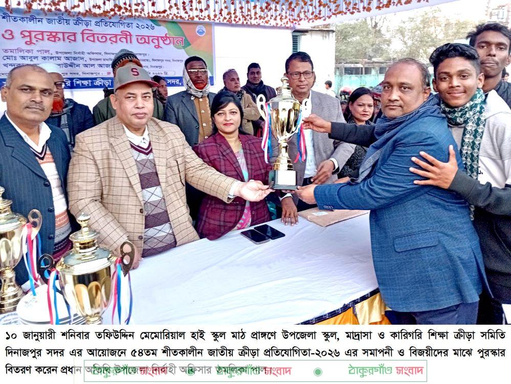 শনিবার তফিউদ্দিন মেমোরিয়াল হাই স্কুল মাঠ প্রাঙ্গণে উপজেলা স্কুল, মাদ্রাসা ও কারিগরি শিক্ষা ক্রীড়া সমিতি দিনাজপুর সদর এর আয়োজনে ৫৪তম শীতকালীন জাতীয় ক্রীড়া প্রতিযোগিতা-২০২৬ এর সমাপনী ও বিজয়ীদের মাঝে পুরস্কার বিতরণ করা হয়েছে।