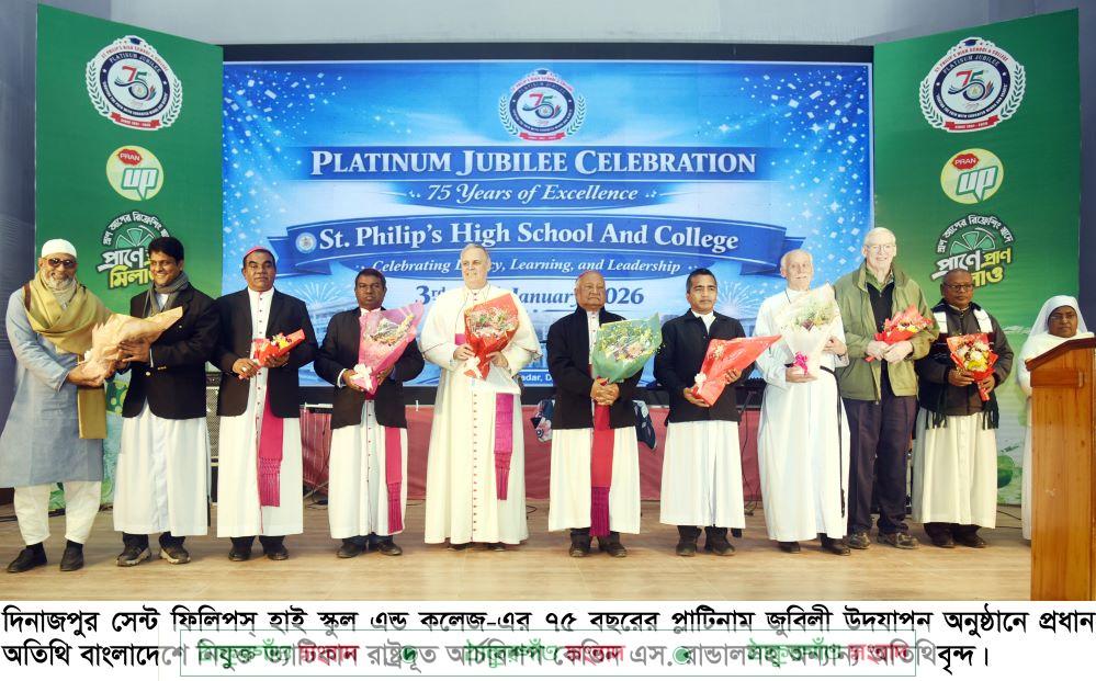 দিনাজপুর সেন্ট ফিলিপস্ হাই স্কুল এন্ড কলেজ-এর ৭৫ বছরের প্লাটিনাম জুবিলী উদযাপনের উদ্বোধনী অনুষ্ঠানে অতিথিদের উত্তরীয় পড়িয়ে ও সম্মাননা ক্রেস্ট প্রদান করেন অধ্যক্ষ ব্রাদার কাজল লিনুস কস্তা সিএসসি।