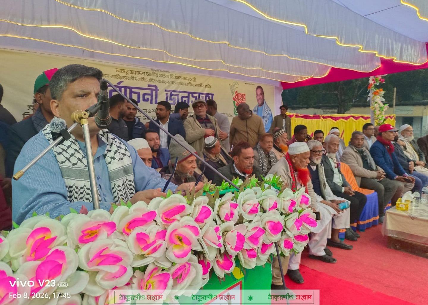 আগামীর বাংলাদেশ হবে রংধনু জাতির বাংলাদেশ। যেখানে নিশ্চিত করা হবে হিন্দু, মুসলিম, খ্রীষ্টান, বৌদ্ধ, সাঁওতাল, গাঢ় উপজাতি সহ বিভিন্ন উপজাতিদের শান্তিপূর্ন বসবাস। থাকবে কোন ভেদাভেদ, থাকবে না কোন বৈষম্য। রবিবার (৮ ফেব্রুয়ারি) বিকেলে পঞ্চগড়ের আটোয়ারী মডেল পাইলট উচ্চ বিদ্যালয় মাঠে অনুষ্ঠিত নির্বাচনী জনসভায় এমনটি প্রধান অতিথির বক্তব্যে বলেন, আসন্ন ত্রয়োদশ জাতীয় সংসদ নির্বাচনে পঞ্চগড়-১ আসন থেকে ধানের শীষ মনোনিত প্রার্থী কেন্দ্রীয় বিএনপি’র আন্তর্জাতিক সম্পর্ক বিষয়ক সম্পাদক ব্যারিষ্টার মুহাম্মদ নওশাদ জমির। জনসভায় সভাপতিত্ব করেন উপজেলা বিএনপি’র সভাপতি এ.জেড.এম বজলুর রহমান জাহেদ। উপজেলা বিএনপি’র সাধারণ সম্পাদক মোঃ নজরুল ইসলাম দুলালের সঞ্চালনায় বিশেষ অতিথি হিসেবে উপস্থিত থেকে বক্তব্য রাখেন পঞ্চগড়-১ আসনের ধানের শীষ মার্কার প্রধান সমন্বয়ক ব্যারিষ্টার মুহাম্মদ নওফেল জমির, জেলা বিএনপি’র আহবায়ক মোঃ জাহিরুল ইসলাম কাচ্চু, যুগ্ন আহবায়ক এম.এ মজিদ ও এ্যাড: মির্জা নাজমুল ইসলাম কাজল, সাবেক পৌর মেয়র আলহাজ¦ মোঃ তৌহিদুল ইসলাম, জেলা বিএনপি নেতা মোঃ ইউনুস শেখ, উপজেলা বিএনপি’র সাবেক সভাপতি ও সাবেক উপজেলা চেয়ারম্যান আলহাজ¦ মোঃ আব্দুর রহমান, সাবেক সদস্য সচিব আলহাজ¦ মোঃ কুদরত-ই-খুদা, মির্জাপুর ইউনিয়নের চেয়ারম্যান মোঃ আঃ সামাদ আজাদ, সাবেক চেয়ারম্যান বীরমুক্তিযোদ্ধা মির্জা নুরুল ইসলাম হেলাল ও মোঃ তৌহিদুল ইসলাম প্রমূখ।