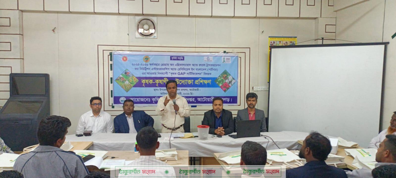 পঞ্চগড়ের আটোয়ারীতে পার্টনার প্রোগ্রামের আওতায় ৩ দিন ব্যাপী উত্তম কৃষি চর্চা বিষয়ক (্্্্্্এঅচ) কৃষক প্রশিক্ষণ অনুষ্ঠিত হয়েছে। উপজেলা কৃষি অফিসার মোস্তাক আহমেদ এর সভাপতিত্বে এবং স্থানীয় কৃষি সম্প্রসারণ অধিদপ্তরের আয়োজনে ২২-২৪ ফেব্রুয়ারি এই তিন দিন কৃষক-কৃষাণী ও উদ্যোক্তা প্রশিক্ষণ অনুষ্ঠিত হয়। প্রশিক্ষণে প্রধান অতিথি হিসেবে উপস্থিত ছিলেন কৃষি সম্প্রসারণ অধিদপ্তর, খামারবাড়ি, পঞ্চগড়ের উপ-পরিচালক মোঃ আব্দুল মতিন। প্রশিক্ষণার্থীদের উত্তম কৃষি চর্চা বিষয় নিয়ে আলোচনা করেন দিনাজপুর অঞ্চলের সিনিয়র মনিটরিং অফিসার (পার্টনার) সঞ্জয় দেবনাথ, অতিরিক্ত উপ-পরিচালক (শস্য) মোঃ সাইফুল ইসলাম ও অতিরিক্ত উপ-পরিচালক (পিপি) বাসুদেব রায়। এছাড়াও প্রশিক্ষণে আলোচনা করেন উপজেলা কৃষি সম্প্রসারণ অফিসার মোঃ ফরহাদ হোসেন এবং মোঃ আফজাল হোসেন। মূলত: বক্তারা কৃষির আধুনিক কলাকৌশল নিয়ে প্রশিক্ষণে আলোচনা করেন। উপজেলার ১৮০ জন কৃষক-কৃষাণী আয়োজিত প্রশিক্ষণে অংশগ্রহন করে।