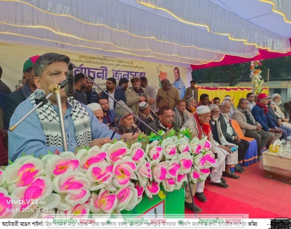 আটোয়ারী (পঞ্চগড়) প্রতিনিধি ঃ ত্রয়োদশ জাতীয় সংসদ নির্বাচনে পঞ্চগড়-১ আসনে বিএনপি মনোনীত প্রার্থীর পক্ষে ধানের শীষের বিশাল জনসভা অনুষ্ঠিত হয়েছে। রবিবার (৮ ফেব্রুয়ারী) বিকেলে আটোয়ারী মডেল পাইলট উচ্চ বিদ্যালয় মাঠে স্থানীয় বিএনপি’র সভাপতি এ.জেড.এম বজলুর রহমান (জাহেদ)এর সভাপতিত্বে নির্বাচনী বিশাল জনসভায় প্রধান অতিথির বক্তব্য রাখেন পঞ্চগড়-১ আসনের বিএনপি মনোনীত ধানের শীষ মার্কার এমপি প্রার্থী বিএনপি’র জাতীয় নির্বাহী কমিটির আন্তর্জাতিক সম্পর্ক বিষয়ক সম্পাদক ব্যারিষ্টার মুহাম্মদ নওশাদ জমির। উপজেলা বিএনপি’র সাধারণ সম্পাদক নজরুল ইসলাম দুলাল ও বিএনপি নেতা মতিয়র রহমানের সঞ্চলানায় অনুষ্ঠিত সভায় বিশেষ অতিথি হিসেবে উপস্থিত ছিলেন ধানের শীষ মার্কা প্রার্থীর ছোট ভাই ব্যারিষ্টার নওফেল জমির, পঞ্চগড় জেলা বিএনপি’র আহবায়ক মোঃ জহিরুল ইসলাম কাচ্চু, পঞ্চগড় পৌর বিএনপি’র আহবায়ক সাবেক মেয়র মোঃ তৌহিদুল ইসলাম, জেলা বিএনপি’র যুগ্ম আহবায়ক এম.এ মজিদ, অ্যাড: মির্জা নাজমুল ইসলাম কাজল, জেলা বিএনপি’র নেতা ইউনুস শেখ। স্থানীয়দের মধ্যে উপস্থিত ছিলেন, উপজেলা বিএনপি’র সাবেক সভাপতি ও সাবেক উপজেলা চেয়ারম্যান আলহাজ্ব মোঃ আব্দুর রহমান(আব্দার), উপজেলা বিএনপি’র সাবেক আহবায়ক আলহাাজ্ব কুদরত-ই-খুদা, বিএনপি নেতা আব্দুস সামাদ আজাদ, আলোয়াখোয়া ইউনিয়নের সাবেক চেয়ারম্যান বিএনপি’র অন্যতম নেতা মোঃ তৌহিদুল ইসলাম, মির্জাপুর ইউনিয়নের সাবেক চেয়ারম্যান বীর মুক্তিযোদ্ধা মির্জা নুরুল ইসলাম হেলাল, উপজেলা, ইউনিয়ন ও ওয়ার্ড পর্যায়ের বিএনপি, অঙ্গ ও সহযোগি সংগঠনের নেতাকর্মীরা। বক্তারা ধানের শীষ প্রতিকে ভোট দিয়ে বিএনপি’র প্রার্থীকে বিজয়ী করার আহবান জানান এবং বলেন, জনগণের অধিকার ও গণতন্ত্র পুনরুদ্ধারে এ নির্বাচন অত্যন্ত গুরুত্বপূর্ণ। প্রধান অতিথির বক্তব্যে ব্যারিষ্টার মুহাম্মদ নওশাদ জমির বলেন, জনাব তারেক রহমান আমাদের যেই নকশা দিয়েছেন আগামীতে তিনি যদি প্রধানমন্ত্রী হন ইনশাআল্লাহ এই দেশ আরো ২৫ বছর সামনে এগিয়ে যাবে। আমরা বিশ^াস করি তারেক রহমান তার যে পরিকল্পনা, এই পরিকল্পনা বাস্তবায়ন করতে পারলে বাংলাদেশের মানুষ সামনের দিকে এগিয়ে যাবে, ইনশাআল্লাহ আর পিছনে তাকাতে হবে না। আমরা সামনের দিকে এগিয়ে যেতে চাই। এজন্য আমাদের কাঁধে কাঁধ মিলিয়ে কাজ করতে হবে। তিনি বলেন, আমি বিশ^াস করি পঞ্চগড়ের মানুষ ১৯৭৯ সালে, ১৯৯১ সালে, ১৯৯৬ সালে এবং ২০০১ সালে বার বার ধানের শীষে ভোট দিয়ে বিএনপিকে যেভাবে বিজয়ী করেছেন এবারো ঠিক সেভাবেই ধানের শীষে ভোট দিয়ে বিএনপিকে সরকার গঠনে সহায়তা করবেন। সভায় আরো বক্তব্য রাখেন আলোয়াখোয়া ইউনিয়নের পঙ্কজ কুমার রায় (ডাবলু) সহ জেলা,উপ