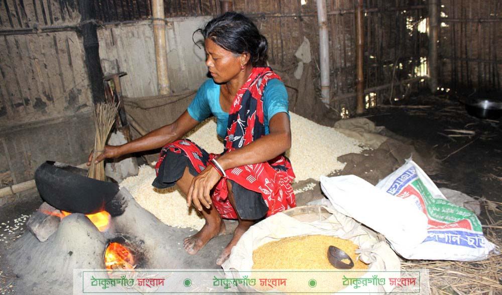 রমজানে চাহিদা বেশি থাকায় হাতে ভাজা মুড়ি প্রস্তুতে ব্যস্ত সময় পার করছেন ঠাকুরগাঁওয়ের মুড়ি পল্লীর নারী শ্রমিকরা। বৃহস্পতিবার সদর উপজেলার হরিনারায়ণপুর এলাকার একটি পরিবারে। ছবি: কালের কণ্ঠ