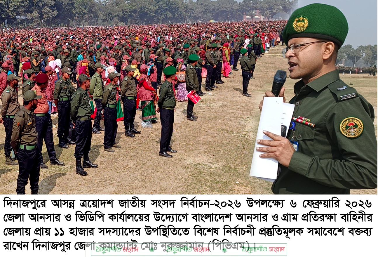 আসন্ন ত্রয়োদশ জাতীয় সংসদ নির্বাচন-২০২৬ উপলক্ষ্যে দিনাজপুরে বাংলাদেশ আনসার ও গ্রাম প্রতিরক্ষা বাহিনীর বিশেষ নির্বাচনী প্রস্তুতিমূলক সমাবেশ অনুষ্ঠিত হয়েছে। শুক্রবার সকাল ১১ টায় দিন্জপুর গোড়-এ শহীদ বড় মাঠে জেলা আনসার ও ভিডিপি কার্যালয়ের উদ্যোগে এই সমাবেশের আয়োজন করা হয়।