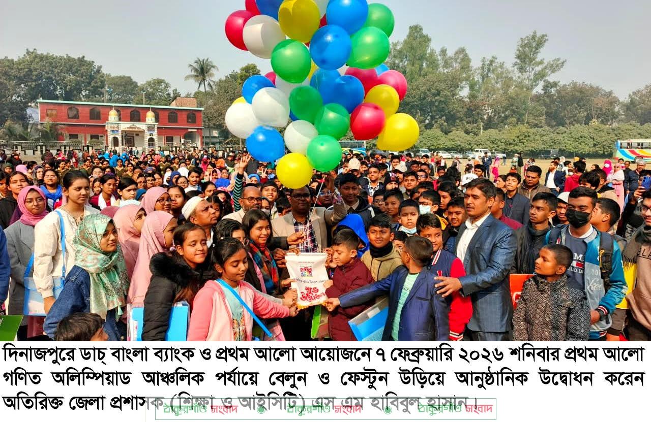 শনিবার সকালে দিনাজপুর আঞ্চলিক গণিত উৎসবে গণিত জয়ের স্বপ্ন নিয়ে পলিটেকনিক ইনস্টিটিউট মাঠে খুদে শিক্ষার্থীদের এমন জমায়েত। ‘গণিত শেখো, স্বপ্ন দেখো’ স্লোগান নিয়ে অনুষ্ঠিত হয়েছে ‘ডাচ্-বাংলা ব্যাংক-প্রথম আলো গণিত উৎসব-২০২৬ এর দিনাজপুর আঞ্চলিক পর্ব। উৎসবের ২৪তম আয়োজনে রংপুর বিভাগের ৩টি জেলা এবং রাজশাহী বিভাগের জয়পুরহাট জেলা থেকে পাঁচ শতাধিক খুদে গণিতবিদ অংশ নিয়েছে।
