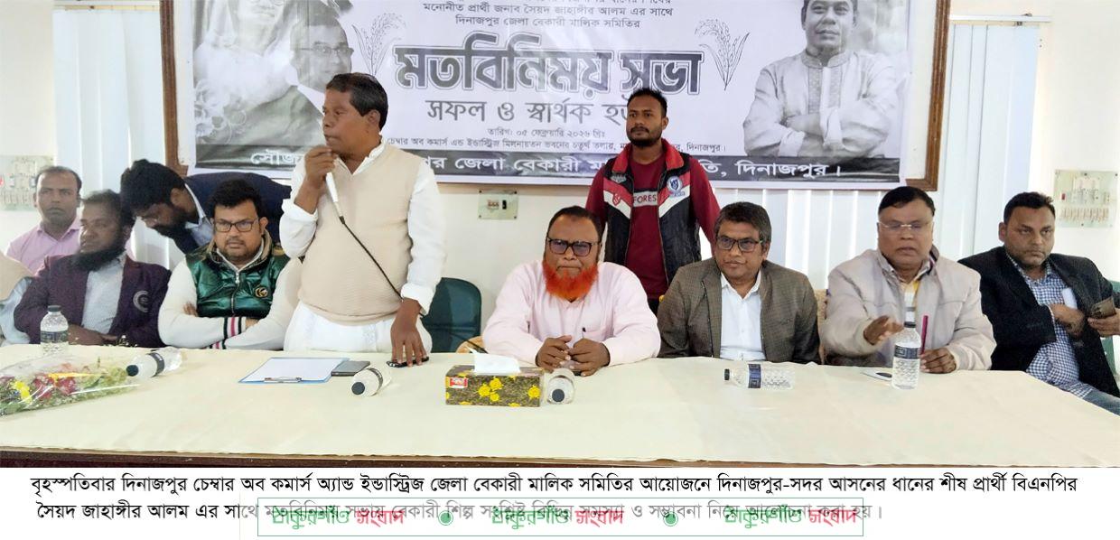 বিএনপির ধানের শীষ প্রতীকের মনোনীত প্রার্থী সৈয়দ জাহাঙ্গীর আলম-এর সঙ্গে দিনাজপুর জেলা বেকারী মালিক সমিতির এক মতবিনিময় সভা অনুষ্ঠিত হয়েছে।