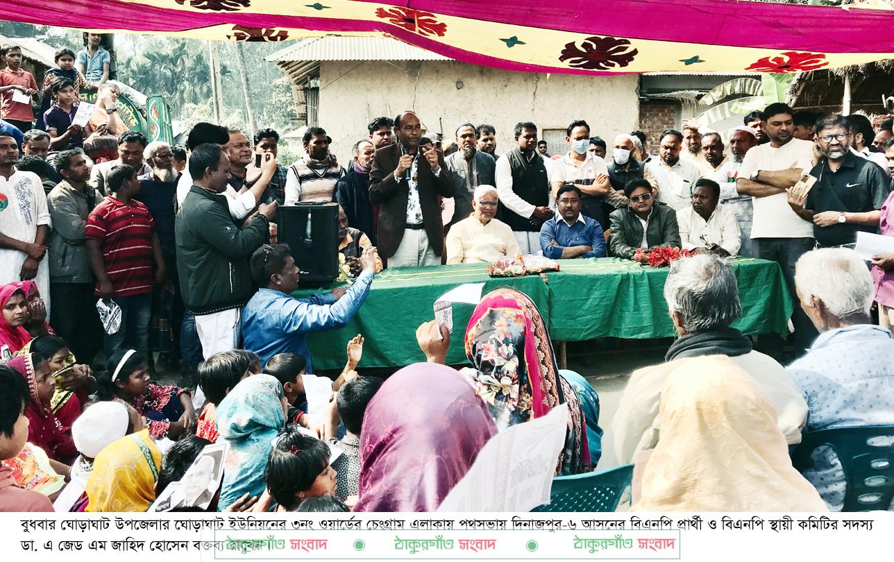 ঘোড়াঘাট ইউনিয়নের ৩নং ওয়ার্ডের চেংগ্রাম এলাকায় অনুষ্ঠিত পথসভায় বক্তব্য রাখতে গিয়ে ডা. জাহিদ হোসেন বলেন, আগামী ১২ ফেব্রুয়ারির নির্বাচনে আপনারা ধানের শীষ প্রতীকে ভোট দিয়ে তারেক রহমানের নেতৃত্বে আমাকে আপনাদের সেবায় কাজ করার সুযোগ করে দিন। নির্বাচিত হলে এলাকার রাস্তাঘাটের উন্নয়ন, মসজিদ-মন্দির সংস্কারসহ সার্বিক উন্নয়নে আপনাদের পাশে থেকে কাজ করবো।