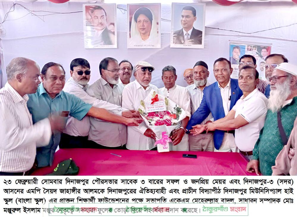 সোমবার দিনাজপুর পৌরসভার সাবেক ৩ বারের সফল ও জনপ্রিয় মেয়র এবং দিনাজপুর-৩ (সদর) আসনের এমপি সৈয়দ জাহাঙ্গীর আলমকে দিনাজপুরের ঐতিহ্যবাহী এবং প্রাচীন বিদ্যাপীঠ দিনাজপুর মিউনিসিপ্যাল হাই স্কুল (বাংলা স্কুল) এর প্রাক্তন শিক্ষার্থী ফাউন্ডেশনের পক্ষে সভাপতি একেএম মেহেরুল্লাহ বাদল, সাধারন সম্পাদক মোঃ মঞ্জুরুল ইসলাম মঞ্জুর নেতৃত্বে সদস্যরা ফুলের তোড়া দিয়ে সংবর্ধনা প্রদান করেছে।