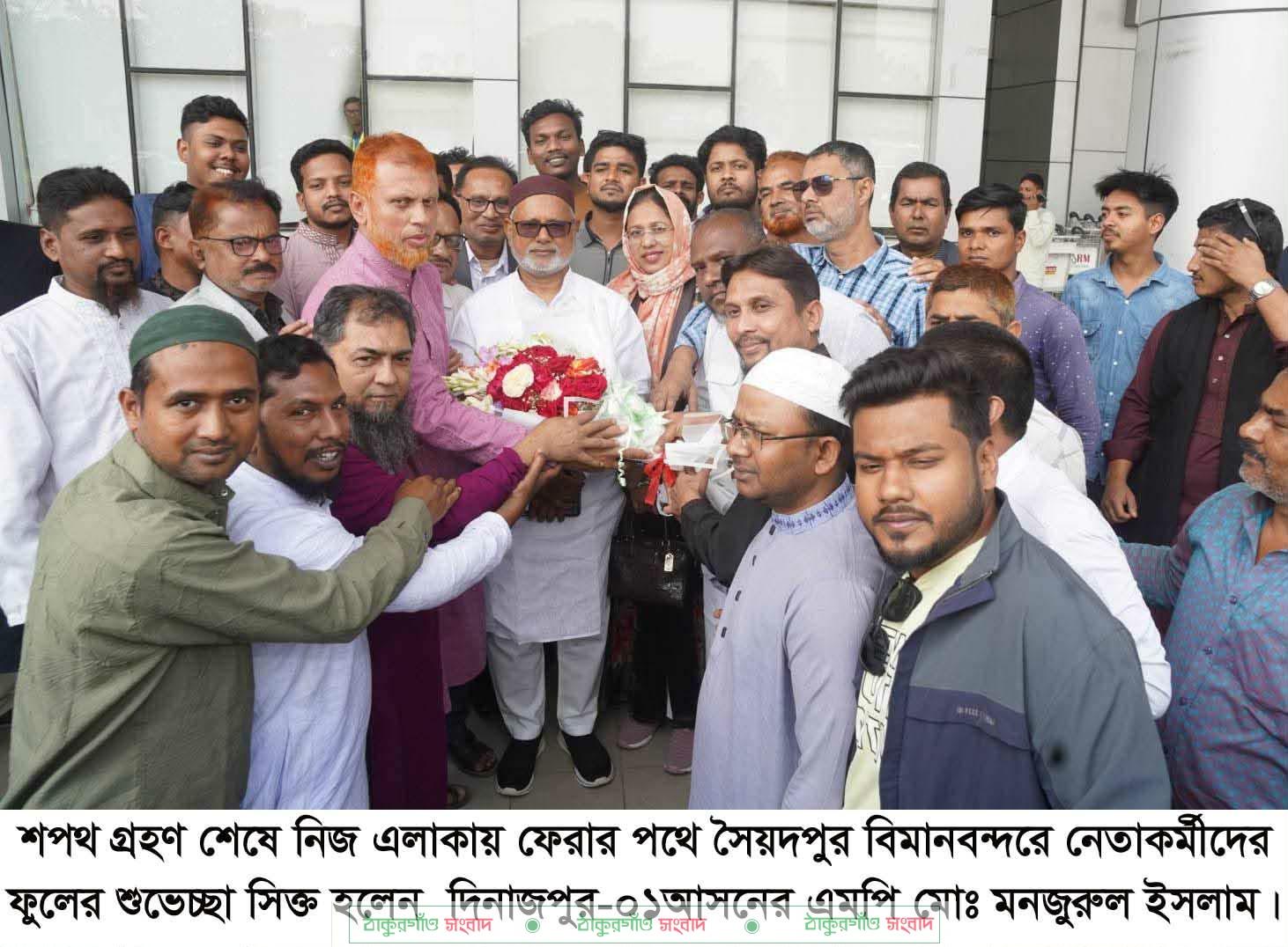 বিকাশ ঘোষ, বীরগঞ্জ (দিনাজপুর) প্রতিনিধিঃ শপথ গ্রহণ শেষে নিজ এলাকায় ফেরার পথে সৈয়দপুর বিমানবন্দরে নেতা কর্মী ও সমর্থকদের ভালোবাসায় সিক্ত সিক্ত হলেন দিনাজপুর-১(বীরগঞ্জ-কাহারোল)আসনের নবনির্বাচিত সংসদ সদস্য বিএনপির আলহাজ্ব মোঃ মনজুরুল ইসলাম।