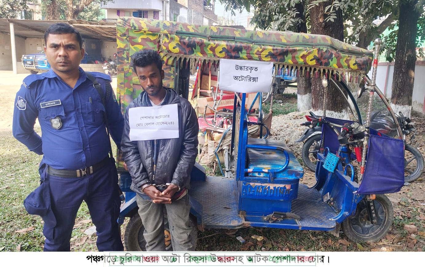 পঞ্চগড়ে চুরি হওয়া একটি অটোরিকসাসহ পেশাদার চোর বেলাল হোসেনকে (২৪) গ্রেফতার করেছে সদর থানা পুলিশ। গত মঙ্গলবার রাতে জেলার সদর উপজেলার সাতমেরা ইউনিয়নের বেংগুটারী এলাকা থেকে তাকে আটক করা হয়। বেলাল হোসেন বেংগুটারী গ্রামের আকবর আলীর ছেলে।
