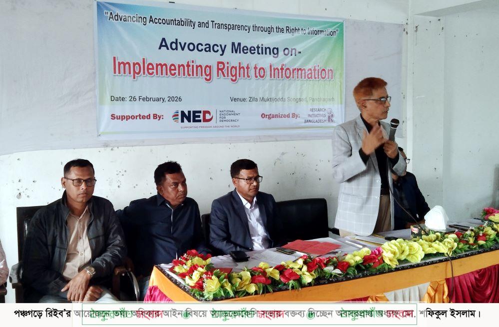 পঞ্চগড়ে তথ্য অধিকার আইন নিয়ে অ্যাডভোকেসি সভা অনুষ্ঠিত হয়েছে। গতকাল বৃহস্পতিবার বিকেলে জেলা মুক্তিযোদ্ধা কমপ্লেক্স হলরুমে ওই সভা অনুষ্ঠিত হয়। এডভান্সিং একাউন্টেবিলিটি এন্ড ট্রান্সপারেন্সী থ্রো দ্যা রাইট অব ইনফরমেশন প্রকল্পের আওতায় ওই সভার আয়োজন করে রিসার্চ ইনিশিয়েটিভস বাংলাদেশ-রিইব। পঞ্চগড় জেলা তথ্য অধিকার বাস্তবায়ন কমিটির উপদেষ্টা ও হান্নান শেখ পাবলিক স্কুল এন্ড কলেজের প্রধান শিক্ষক সাইফুল ইসলাম শাহিনের সভাপতিত্বে অ্যাডভোকেসি সভায় প্রধান অতিথি ছিলেন পঞ্চগড় জেলা সরকারি কলেজ শিক্ষক সমিতির সাধারণ সম্পাদক সাইফ সাইফুল্লাহ। সভায় বিশেষ অতিথি হিসেবে বক্তব্য দেন সাবেক অধ্যক্ষ মো. শফিকুল ইসলাম, পঞ্চগড় প্রেসক্লাবের সাধারণ সম্পাদক সরকার হায়দার ও সাংবাদিক সামসউদ্দীন চৌধুরী কালাম। অ্যাডভোকেসি সভায় তথ্য অধিকার আইন ও রিইব পঞ্চগড়’র চলমান কার্যক্রমের তথ্য উপস্থাপন করেন রিইব’র সিনিয়র প্রোগ্রাম অফিসার মো. মতিউর রহমান। সভায় পঞ্চগড় জেলা তথ্য অধিকার বাস্তবায়ন কমিটির সদস্যরা অংশগ্রহণ করেন।