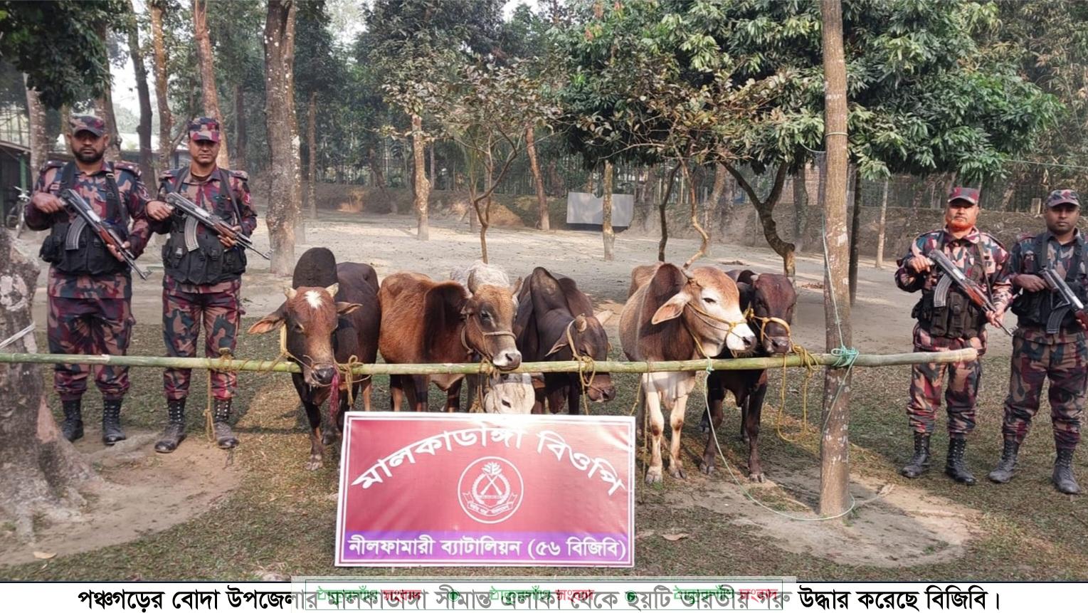 বিজিবি সূত্রে জানা গেছে, ঠাকুরগাঁও সেক্টরের অধীনস্থ নীলফামারী ব্যাটালিয়ন (৫৬ বিজিবি) সীমান্তে চোরাচালান প্রতিরোধে নিয়মিত অভিযান পরিচালনার অংশ হিসেবে গোপন সংবাদের ভিত্তিতে মালকাডাঙ্গা বিওপির একটি বিশেষ টহল দল সীমান্ত পিলার ৭৭৫/১০-এস থেকে প্রায় এক কিলোমিটার বাংলাদেশের অভ্যন্তরে বোদা উপজেলার বড়শশী ইউনিয়নের বগদুলঝুলা নাউতরী এলাকায় ভারত থেকে চোরাচালান করে আনা মালিকবিহীন ওই ছয়টি গরু আটক করে। আটক হওয়া গরুগুলোর আনুমানিক বাজারমূল্য ছয় লাখ টাকা।