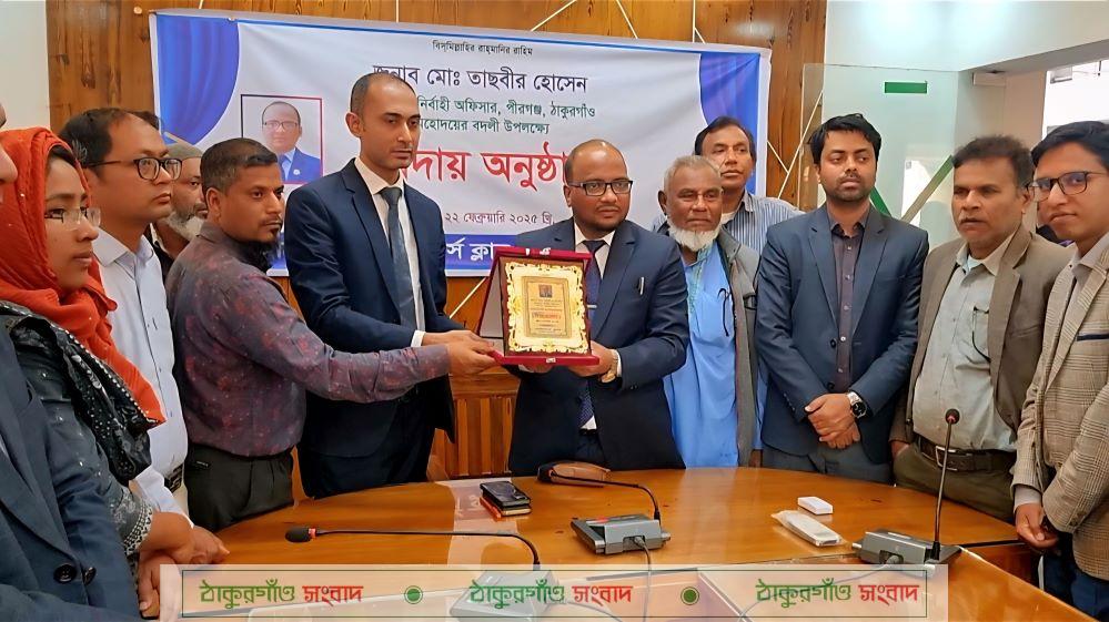 পীরগঞ্জ প্রতিনিধি : ঠাকুরগাঁওয়ের পীরগঞ্জ উপজেলার নির্বাহী অফিসার (ইউএনও) তাছবীর হোসেনকে (বদলি জনিত) বিদায় সংবর্ধনা দেওয়া হয়েছে।