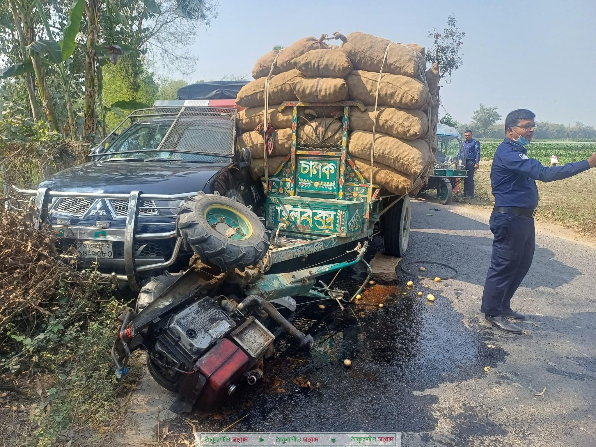 বালিয়াডাঙ্গী(ঠাকুরগাঁও) প্রতিনিধি: ঠাকুরগাঁও- বালিয়াডাঙ্গীর জোতপারার ঢোরামারা পুকুর সংলগ্ন পাকা রাস্তায় আলু বোঝাই ভোটভোটি নিয়ন্ত্রণ হারিয়ে হরিপুর থানা পুলিশের একটি পিকাপ ভ্যানের সাথে সংঘর্ষ হয়। এতে পুলিশের পিকাপ ভ্যানটি রাস্তার ধারে পরে যায়।