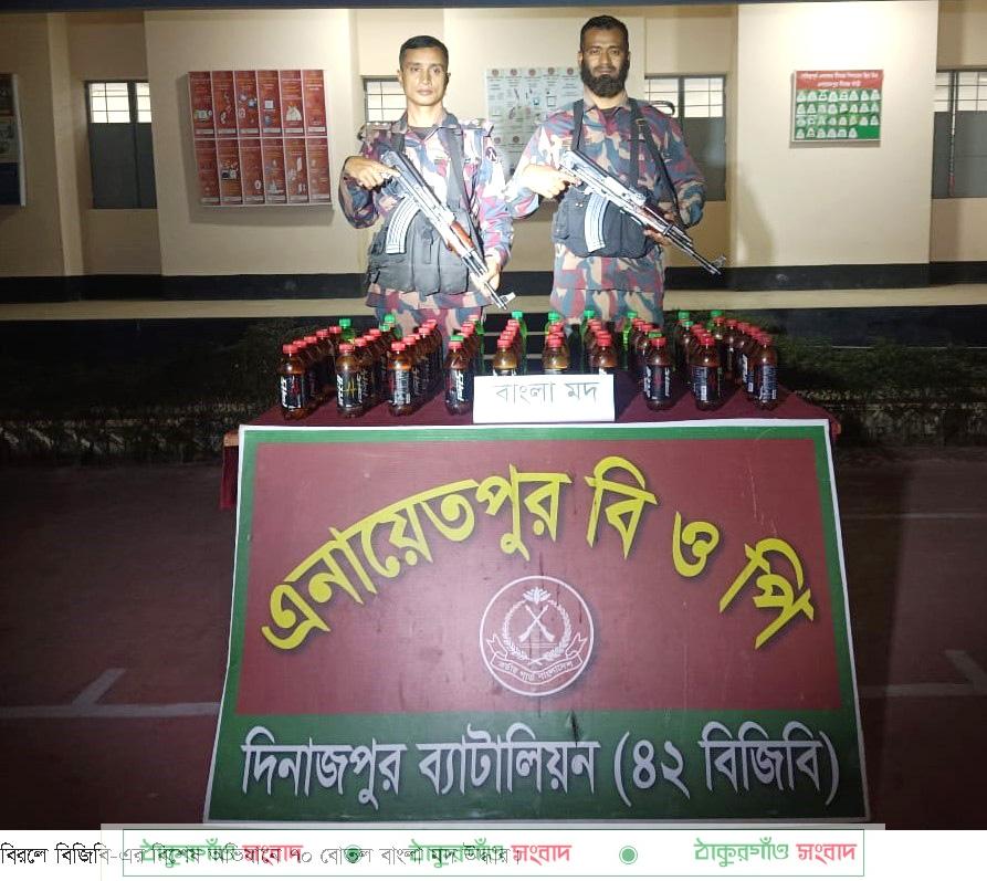 মঙ্গলবার রাত পৌনে ৮ টার দিকে দিনাজপুর ব্যাটালিয়ন (৪২ বিজিবি) এর অধীনস্থ উপজেলার ৮নং ধর্মপুর ইউনিয়নের এনায়েতপুর বিওপি’র একটি টহল দল চোরাচালান বিরোধী বিশেষ অভিযান পরিচালনা করে। এসময় সীমান্ত পিলার নং- ৩২২/২-এস থেকে আনুমানিক ১ কিঃমিঃ বাংলাদেশের অভ্যন্তরে গোদাবাড়ী শালবাগান নামক স্থানে তল্লাশী চালিয়ে মালিকবিহীন অবস্থায় ৭০ বোতল বাংলা মদ উদ্ধার করা হয়। উদ্ধারকৃত মাদকদ্রব্যের সিজার মূল্য দেখানো হয়েছে ২১ হাজার টাকা।