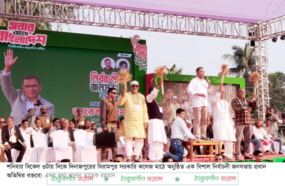 শনিবার বিকেল ৩টায় দিকে দিনাজপুরের বিরামপুর সরকারি কলেজ মাঠে অনুষ্ঠিত এক বিশাল নির্বাচনী জনসভায় প্রধান অতিথির বক্তব্যে এসব কথা বলেন তারেক রহমান। হাজারো নেতাকর্মী ও সাধারণ মানুষের উপস্থিতিতে জনসভাটি উৎসবমুখর ও প্রাণবন্ত পরিবেশে অনুষ্ঠিত হয়।