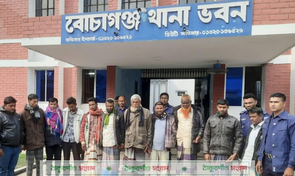 মোঃ শামসুল আলম, বোচাগঞ্জ (দিনাজপুর) থেকে!! দিনাজপুরের বোচাগঞ্জে ১ফেব্রুয়ারি রবিবার ১৩ জুয়ারুকে বংগীয় প্রকাশ্য জুয়া আইন, ১৮৬৭ এর ০৪ ধারা লংঘনের অপরাধে ভ্রাম্যমান আদালতের মাধ্যমে ৭দিনের কারাদণ্ড দিয়েছে উপজেলা নির্বাহী অফিসার মোঃ মারুফ হাসান। থানা সূত্রে জানা গেছে, গত ৩১জানুয়ারী শনিবার দিবাগত রাত আনুমানিক ১১টার সময গোপন সংবাদের ভিত্তিতে বোচাগঞ্জ থানার অফিসার ইনচার্জ মোঃ মিজানুর রহমানের নির্দেশে এস.আই আজাদ, এস. আই আনিস, এএসআই কাউসার, এএসআই শামীম সঙ্গীও ফোর্স সহ উপজেলার ৩নং- মুর্শিদহাট ইউনিয়নের চাপাইতোর মোজাতি বাজার সংলগ্ন হাসকিং মিলের চাতালে অভিযান চালিয়ে মোঃ রেজাউল ইসলাম (৩৯) পিতা মৃতঃ মকসেদ আলী, সাং- বাইশপুর, মোঃ নাজমুল ইসলাম (৩৪) পিতা মোঃ সাত্তার, সাং- আটগাঁও, মুক্তারুল ইসলাম (২৪) পিতা বাবুল ইসলাম, সাং- চাপাইতোর মাঝাপাড়া, শামসুল হক (৬৪) পিতা মৃতঃ নমির উদ্দিন, সাং- আটগাঁও, গোপাল চন্দ্র রায় (২৫) পিতা মৃতঃ জতেস চন্দ্র রায়, সাং- চাপাইতোর, শাহ আলম (২৪) পিতা মৃতঃ ছবির উদ্দিন, সাং- বাইশপুর, ওবায়দুল ইসলাম (৫৩), পিতা মৃতঃ আমির উদ্দিন, সাং- বাইশপুর, নয়ন ইসলাম (২৬), পিতা মৃত- মিরাজুল ইসলাম, সাং- আটগাও, মোঃ মহিদুল ইসলাম (৩৫), পিতা মৃত- তছর উদ্দিন, সাং- আটগাও, জিয়ারুল ইসলাম (৪০) পিতা মৃতঃ ছলিম উদ্দিন, সাং- আটগাঁও কবিরাজপাড়া, মোঃ হামিদুল ইসলাম (৫৫) পিতা মৃত- আছির উদ্দিন, সাং- বাইশপুর, আনোয়ার হোসেন (৩৬) পিতা আব্দুল জব্বার, সাং-আটগাঁও কবিরাজপাড়া ও মোঃ রেজাউল ইসলাম (৩০) পিতা আফির উদ্দিন সকলের থানা বোচাগঞ্জ জেলা দিনাজপুরকে আটক করে থানায় নিয়ে আসে। ১ ফেব্রুয়ারি রবিবার আটককৃতদের উপজেলা নির্বাহী অফিসারের কাছে হাজির করা হলে উপজেলা নির্বাহী অফিসার মারুফ হাসান ভ্রাম্যমান আদালতের মাধ্যমে প্রত্যেককে ৭দিনের কারাদণ্ড প্রদান করেন। সাজাপ্রাপ্তদের পুলিশি পাহারায় দিনাজপুর জেল হাজতে প্রেরণ করা হয়েছে।