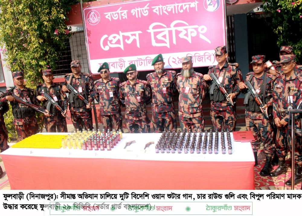ফুলবাড়ী (দিনাজপুর) প্রতিনিধি॥ দিনাজপুর সীমান্তে অভিযান চালিয়ে দুটি বিদেশি ওয়ান শুটার গান, চার রাউন্ড গুলি এবং বিপুল পরিমাণ মাদক উদ্ধার করেছে ফুলবাড়ী ২৯ বিজিবি (বর্ডার গার্ড বাংলাদেশ)। ত্রয়োদশ জাতীয় সংসদ নির্বাচনকে সামনে রেখে সীমান্তে বাড়তি নজরদারির অংশ হিসেবে এ অভিযান পরিচালনা করা হয়।