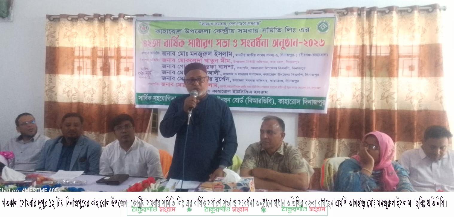 কাহারোল (দিনাজপুর) প্রতিনিধিঃ দিনাজপুরের কাহারোল উপজেলা কেন্দ্রীয় সমবায় সমিতি লিঃ এর মাসিক সাধারণ সভা ও নব-নির্বাচিত সংসদ সদস্যকে সংবর্ধনা প্রদান করা হয়েছে। গতকাল সোমবার (৯ মার্চ’২৬) দুপুর ১২ টার দিকে কাহারোল উপজেলা ইউসিসিএ-এর হল রুমে বাংলাদেশ পল্লী উন্নয়ন বোর্ড (বিআরডিবি) কাহারোল, দিনাজপুরের সার্বিক সহযোগীতায় এই বার্ষিক সাধারণ সভা ও সংবর্ধনা অনুষ্ঠান অনুষ্ঠিত হয়। উপজেলা কেন্দ্রীয় সমবায় সমিতি লিঃ ও পরিচালক বাংলাদেশ জাতীয় পল্লী উন্নয়ন সমবায় ফেডারেশন, রংপুর অঞ্চলের সভাপতি মোঃ নূরুল ইসলামের সভাপতিত্বে অনুষ্ঠিত ৪২ তম বার্ষিক সাধারণ সভা ও সংবর্ধনা অনুষ্ঠানে প্রধান অতিথি ছিলেন, দিনাজপুর-১(বীরগঞ্জ-কাহারোল) আসনের নব-নির্বাচিত জাতীয় সংসদ সদস্য আলহাজ্ব মোঃ মনজুরুল ইসলাম। অনুষ্ঠানে বিশেষ অতিথি ছিলেন যথাক্রমে সহকারি কমিশনার (ভুমি) প্রবীর বিশ্বাস, উপজেলা বিএনপির সভাপতি মোঃ গোলাম মোস্তফা বাদশা, সাধারণ সম্পাদক প্রভাষক মোঃ শামীম আলী, উপজেলা সমবায় অফিসার মোঃ সারওয়ার মুর্শেদ। অনুষ্ঠানে অন্যদের মধ্যে বক্তব্য রাখেন, উপজেলা পল্লী উন্নয়ন কর্মকর্তা আরিফা আরমান আরা, উপজেলা সহকারি পল্লী উন্নয়ন কর্মকর্তা মোঃ গোলাম রহমানসহ উপজেলার ৬টি ইউনিয়নের উপজেলা কেন্দ্রীয় সমবায় সমিতি লিঃ কর্তৃক গঠনকৃত সমবায় সমিতির সভাপতি ও সাধারণ সম্পাদকবৃন্দ।