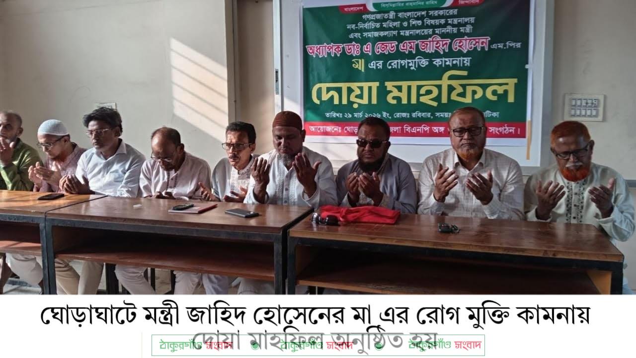 ঘোড়াঘাট(দিনাজপুর)প্রতিনিধি.দিনাজপুরের ঘোড়াঘাট উপজেলা বিএনপির আয়োজনে মহিলা ও শিশু বিষয়ক মন্ত্রণালয় এবং সমাজকল্যাণ মন্ত্রণালয়ের মন্ত্রী অধ্যাপক ডা. এজেডএম জাহিদ হোসেন এমপির মায়ের রোগ মুক্তি কামনা করে দোয়া মাহফিল অনুষ্ঠিত হয়েছে।