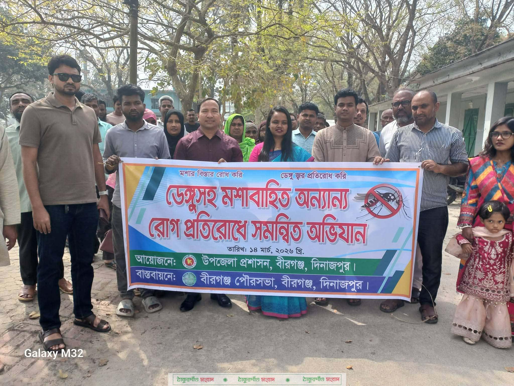 দিনাজপুরের বীরগঞ্জে ডেঙ্গুসহ মশাবাহিত বিভিন্ন রোগ প্রতিরোধে সমন্বিত পরিচ্ছন্নতা ও সচেতনতামূলক অভিযান অনুষ্ঠিত হয়েছে। “মশার বিস্তার রোধ করি, ডেঙ্গু জ্বর প্রতিরোধ করি” প্রতিপাদ্যকে সামনে রেখে শনিবার (১৪ মার্চ) সকালে উপজেলা পরিষদ চত্বরে এ কর্মসূচি পালন করা হয়।