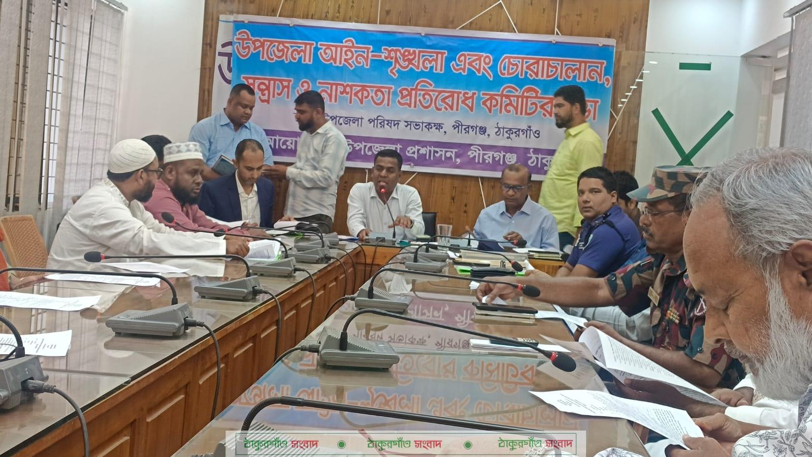 ঠাকুরগাঁওয়ের পীরগঞ্জে আইনশৃঙ্খলা, চোরাচালান ও সন্ত্রাস নাশকতা প্রতিরোধ এবং বাল্য বিবাহ প্রতিরোধ কমিটির সভা হয়েছে। মঙ্গলবার সকালে উপজেলা প্রশাসনের আয়োজনে উপজেলা পরিষদ সভাকক্ষে এ সভা অনুষ্ঠিত হয়। উপজেলা নিবার্হী অফিসার গোলাম রব্বানী সরদারের সভাপতিত্বে এতে বক্তব্য দেন সহকারি কমিশনার (ভূমি) এনএম ইশফাকুল কবীর, উপজেলা কৃষি অফিসার নাজমুল হোসেন, উপজেলা বিএনপির সাধারণ সম্পাদক ও সাবেক উপজেলা চেয়ারম্যান জিয়াউল ইসলাম জিয়া, পৌর বিএনপির সাধারণ সম্পাদক রেজাউল করিম রাজা, উপজেলা জামায়াতের ভারপ্রাপ্ত আমীর বাবুল আহম্মেদ ও সাবেক আমীর বাবলুর রশীদ, উপজেলা স্বাস্থ্য কমপ্লেক্ষের আবাশিক মেডিকেল অফিসার ডা. ওয়ারিসুল ইয়াজদানী, পীরগঞ্জ থানার উপ-পরিদর্শক আব্দুল হালিম, ফায়ার সার্ভিস সিভিল ডিফেন্স স্টেশন অফিসার গোলাম মোস্তফা, উপজেলা দুর্নীতি প্রতিরোধ কমিটির সভাপতি মোকাদ্দেস হায়াত মিলন, কোষারানীগঞ্জ ইউপি চেয়ারম্যান অধ্যক্ষ গোলাম মোস্তফা, পীরগঞ্জ সদর ইউপি চেয়ারম্যান মোখলেসুর রহমান, সেনগাঁও ইউপি চেয়ারম্যান সাইদুর রহমান, বৈরচুনা ইউপি চেয়ারম্যান টেলিনা সরকার হিমু, ভোমরাদহ ইউপি ভারপ্রাপ্ত চেয়ারম্যান আব্দুল মজিদ, হাজিপুর ইউপি চেয়ারম্যান জয়নাল আবেদীন, জাবরহাট ইউপি চেয়ারম্যান জিয়াউর রহমান জিয়া, খনগাঁও ইউপি চেয়ারম্যান আব্দুস সহিদ, উপজেলা প্রাথমিক শিক্ষা কর্মকর্তা রাহিম উদ্দীন, মহিলা বিষয়ক কর্মকর্তা জিন্নাতারা ইয়াসমিন, উপজেলা মহিলা দলের যুগ্ম আহবায়ক ও বিভাগীয় জয়িতা নাহিদ পারভিন রিপা প্রমুখ।