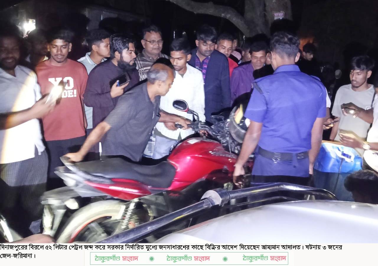 বিরল (দিনাজপুর) প্রতিনিধি ॥ দিনাজপুরের বিরলে অবৈধভাবে জ¦ালানী তেল (পেট্রল) বেশি দামে বিক্রি করার উদ্দেশ্যে পরিবহন করার অপরাধে বাবা’র পর এবার ছেলেকে ৫ দিনের বিনাশ্রম কারাদন্ডসহ ৬ হাজার টাকা জরিমানার আদেশ প্রদান করেছেন ভ্রাম্যমান আদালত। একই সাথে জড়িত আরও ২ জনকে ৪ হাজার টাকা জরিমানাসহ জব্দকৃত ৫২ লিটার পেট্রল সরকার নির্ধারিত মূল্যে উপস্থিত জনসাধারণের নিকট বিক্রি করে সরকারি কোষাগারে জমা দেয়ার আদেশ প্রদান করা হয়েছে।