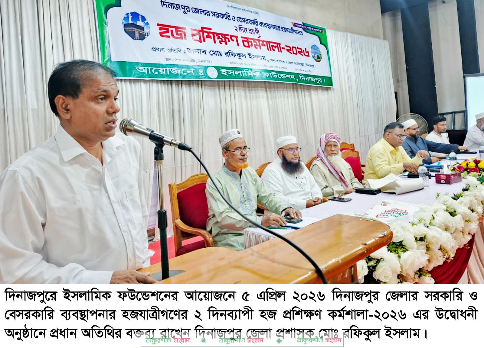 ৫এপ্রিল সকাল ৯টায় শিশু একাডেমির মিলনায়তনে দিনাজপুর জেলার সরকারি ও বেসরকারি ব্যবস্থাপনার হজযাত্রীগণের ২ দিনব্যাপী হজ প্রশিক্ষণ কর্মশালা-২০২৬ এর আনুষ্ঠানিক উদ্বোধন করা হয়েছে।
