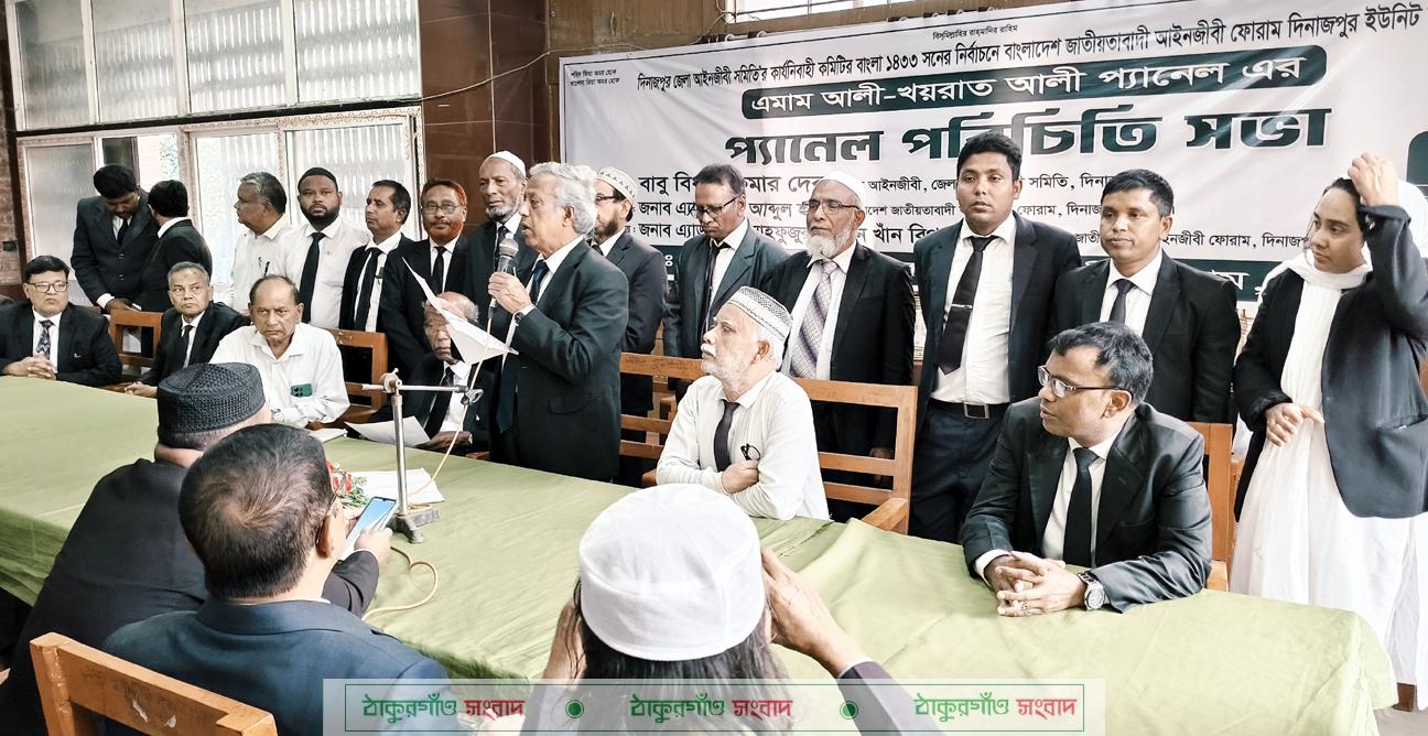 দিনাজপুর জেলা আইনজীবী সমিতির কার্যকরি কমিটির বাংলা ১৪৩৩ সনের নির্বাচনে জাতীয়তাবাদী আইনজীবী ফোরাম সমর্থিত এমাম আলী-খয়রাত আলী প্যানেলের পরিচিতি সভা অনুষ্ঠিত হয়েছে।