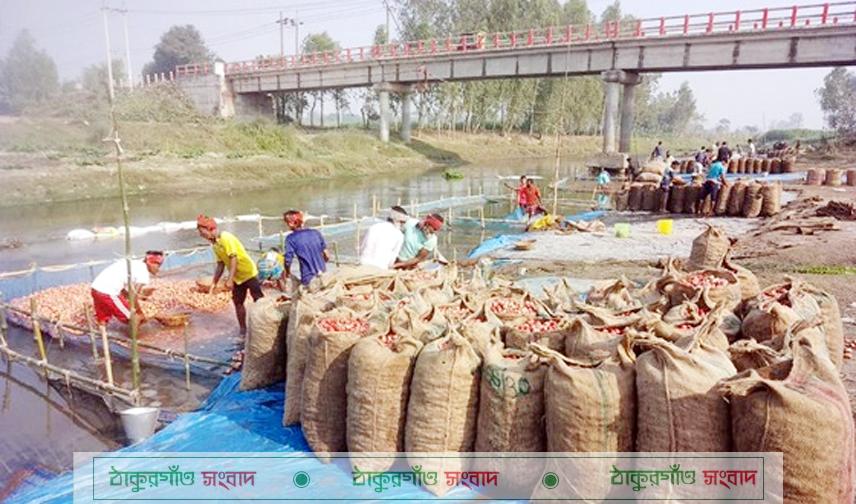 দিনাজপুরের ফুলবাড়ীতে গত বছরের তুলনায় আলুর বস্তার দাম বেড়েছে দ্বিগুণেরও বেশি। চরম আকার ধারণ করেছে বস্তাসংকট। এর প্রভাব পড়েছে আলুর দামে। বস্তার দাম বেশি হওয়ায় গত দুই দিনে কেজিতে আলুর দাম পড়ে গেছে ২ থেকে ৩ টাকা। গত মঙ্গলবার (৩১ মার্চ) ক্যারেজ জাতের যে আলু প্রতিকেজি ১৫ থেকে ১৬ টাকা বিক্রি হয়েছে, শনিবার (৪ এপ্রিল) সেই আলুর দাম ১২ থেকে ১৩ টাকায় নেমেছে। তবু ক্রেতা পাওয়া যাচ্ছে না। বস্তার অভাবে বাড়ীর পাশে আলু স্তূপ করে রাখছেন চাষিরা। চাষি ও ব্যবসায়ীরা বলছেন, গত বছর যে বস্তার দাম ছিল ৭৫ থেকে ৮০ টাকা। এবার সেই বস্তা বিক্রি হচ্ছে ১৭৫ থেকে ১৮০ টাকায়। এ নিয়ে আলুচাষি ও ব্যবসায়ীরা চরম বিপাকে পড়েছেন। তাদের অভিযোগ, পাটের দাম বৃদ্ধিসহ কিছু কিছু হিমাগার কর্তৃপক্ষ কৃত্রিম সংকট সৃষ্টি করে বস্তার দাম বাড়াচ্ছেন। উপজেলা কৃষি সম্প্রসারণ অধিদপ্তর সূত্রে জানা গেছে, গত বছর উপজেলায় এবছর লক্ষ্যমাত্রা নির্ধারণ করা হয়েছিল ১৮ হাজার ৮০ হেক্টর এবং চাষও একই পরিমাণেি জমতে। এতে উৎপাদনের লক্ষ্যমাত্রা ধরা হয়েছে ৩৫ হাজার ৫২০ মেট্রিক টন আলু। উপজেলার শিবনগর ইউনিয়নের পাঠকপাড়া গ্রামের আলু চাষি জাহাঙ্গীর আলম এবার পৌনে চার বিঘা জমিতে ক্যারেজ জাতের আলু চাষ করেছিলেন। ফলন ভালো হয়েছে তার। গত বৃহস্পতিবার (২ এপ্রিল) এক ব্যবসায়ী ১৫ টাকা কেজি দাম বলে গেছেন। শুক্রবার (৩ এপ্রিল) তার আলু নিতে আসার কথা ছিল। কিন্তু ওই ব্যবসায়ী জানিয়েছেন, বস্তা সংকটের কারণে আলু নিতে আসতে পারছেন না। এখন বাড়ীতেই কষ্ট করে আলু রাখতে হচ্ছে।= উপজেলার রাজারামপুর গ্রামের আলুচাষি ও ব্যবসায়ী আব্দুর রহমান বলেন, গত বছর ৭৫ থেকে ৮৫ টাকার মধ্যে বস্তা পাওয়া গেছে। এবছর মৌসুমের শুরু থেকেই ১২০ টাকা করে বস্তা কিনতে হয়েছে। ঈদের এক দিন পর ১৬০ টাকা করে বস্তা কিনেছেন। বস্তার অভাবে আলু কিনতে পারছেন না। এখন দাম উঠেছে ১৮০ টাকা। মেলাবাড়ী এলাকার আলু চাষি আল আমিন বলেন, বস্তার অভাবে নিজের উৎপাদিত আলু মাত্র ৬ বস্তা ফুলবাড়ী কোল্ড স্টোরেজে সংরক্ষণ করা সম্ভব হয়েছে। বাড়তি আলু বিক্রির অভাবে বাড়ীতেই পড়ে রয়েছে। রাজারামপুর মৎস্যপাড়া গ্রামের আলু চাষি মো. মামুন বলেন, ২২৫ বস্তা আলু হয়েছে। তার মধ্যে মাত্র ৩১ বস্তা আলু ইতোমধ্যে হিমাগারে রেখে দিয়েছেন। বাকি ১৯৪ বস্তা আলুর জন্য বস্তা খুঁজে পাচ্ছেন না। গত বছর যে বস্তার দাম সর্বোচ্চ ৮০ টাকা ছিল, এবার সেই বস্তা ১৮০ টাকা হয়েছে। বস্তার সংকটের কারণে আলুর দামও পড়ে গেছে। বারাইহাট এলাকার আলু চাষি কার্তিক চন্দ্র রায় ৩ বিঘা জমিতে আলু চাষ করেছেন। তার ১৫০ বস্তা আলু হয়েছে। তিনি বুধবার (১ এপ্রিল মার্চ) ১৬ টাকা কেজি দরে আলুর দাম মিটিয়ে স্থানীয় এক ব্যবসায়ী তাকে ৫হাজার টাকা অগ্র