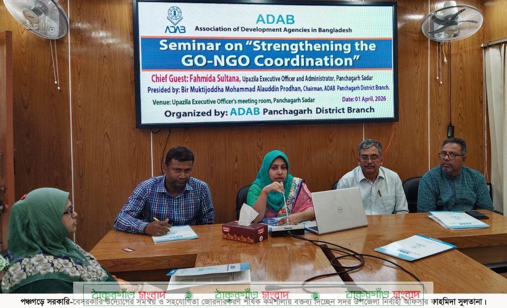পঞ্চগড়ে ‘সরকারি-বেসরকারি উদ্যোগের সমন্বয় ও সহযোগিতা জোরদারকরণ’ শীর্ষক সেমিনার অনুষ্ঠিত হয়েছে। গতকাল বুধবার সদর উপজেলা পরিষদ হলরুমে ওই সেমিনারের আয়োজন করে এসোসিয়েশন অব ডেভেলপমেন্ট এজেন্সিজ ইন বাংলাদেশ-এডাব। সেমিনারে প্রধান অতিথি হিসেবে উপস্থিত ছিলেন সদর উপজেলা নির্বাহী কর্মকর্তা ফাহমিদা সুলতানা। এডাব পঞ্চগড় জেলা শাখার সভাপতি বীর মুক্তিযোদ্ধা মোহাম্মদ আলাউদ্দিন প্রধানের সভাপতিত্বে সেমিনারে বিশেষ অতিথি হিসেবে উপস্থিত ছিলেন সদর উপজেলা কৃষি কর্মকর্তা মো. আসাদুন্নবী, সদর উপজেলা সমবায় অফিসার রোকেয়া খাতুন, সিনিয়র উপজেলা মৎস্য কর্মকর্তা হিমেল চন্দ্র রায়, উপজেলা সমাজসেবা কর্মকর্তা লায়লা আরজুমান ও উপজেলা প্রাণিসম্পদ কর্মকর্তা মরিয়ম রহমান, বিআরডিবি’র সুজন চন্দ্র দাস। বক্তব্য দেন এডাব পঞ্চগড় জেলা শাখার সাধারণ সম্পাদক সফিকুল আলম দোলন, সহ সভাপতি মো. নাজিমউদ্দীন প্রমূখ।