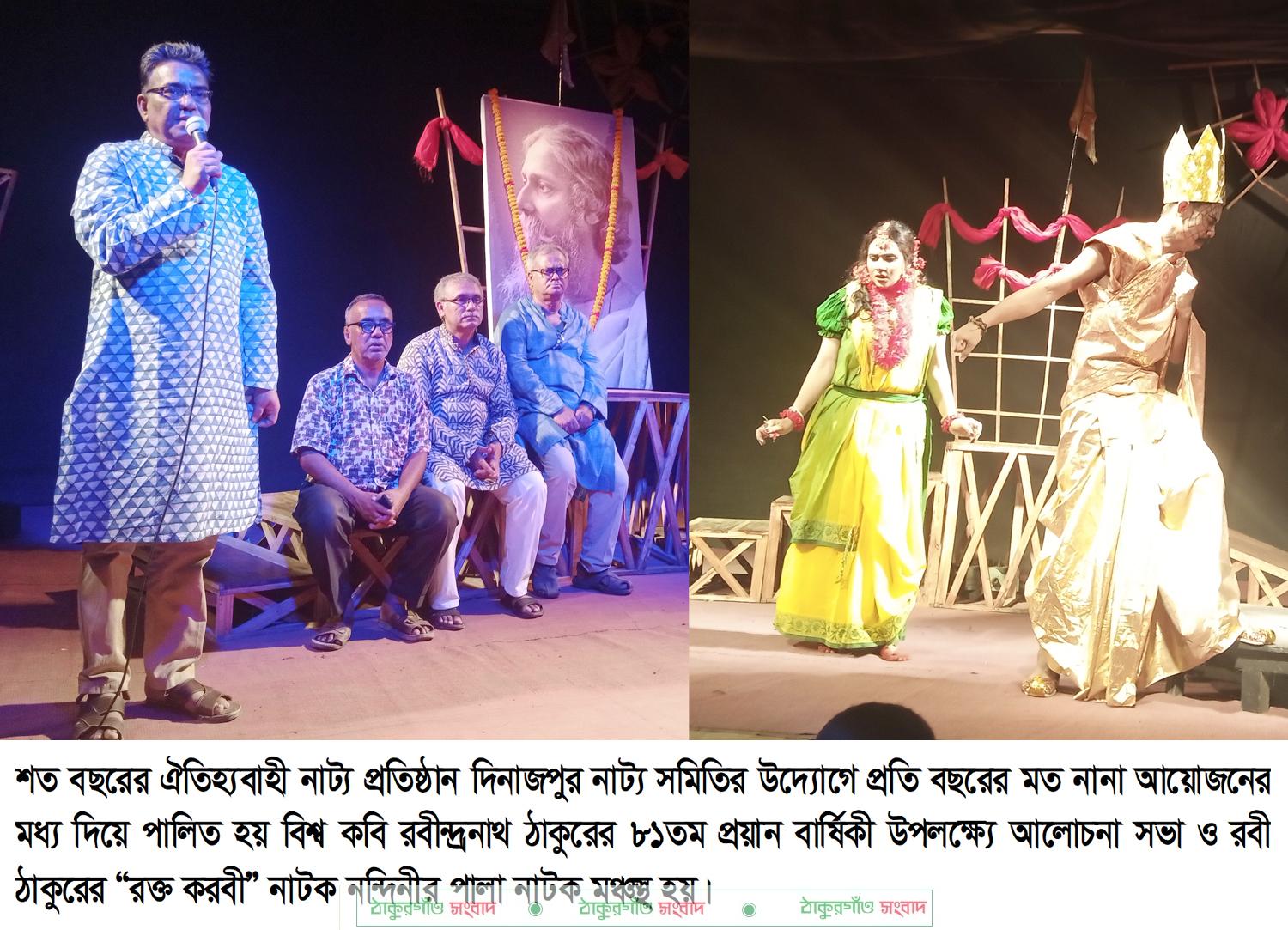 শত বছরের ঐতিহ্যবাহী নাট্য প্রতিষ্ঠান দিনাজপুর নাট্য সমিতির উদ্যোগে প্রতি বছরের মত নানা আয়োজনের মধ্য দিয়ে পালিত হয় বিশ^ কবি রবীন্দ্রনাথ ঠাকুরের ৮১তম প্রয়ান বার্ষিকী। এ উপলক্ষ্যে আলোচনা সভা ও রবী ঠাকুরের “রক্ত করবী” অবলম্বনে ও তরুন নাট্য পরিচালক সম্বিত সাহা’র নির্দেশনায় নন্দিনীর পালা নাটক মঞ্চস্থ হয়।