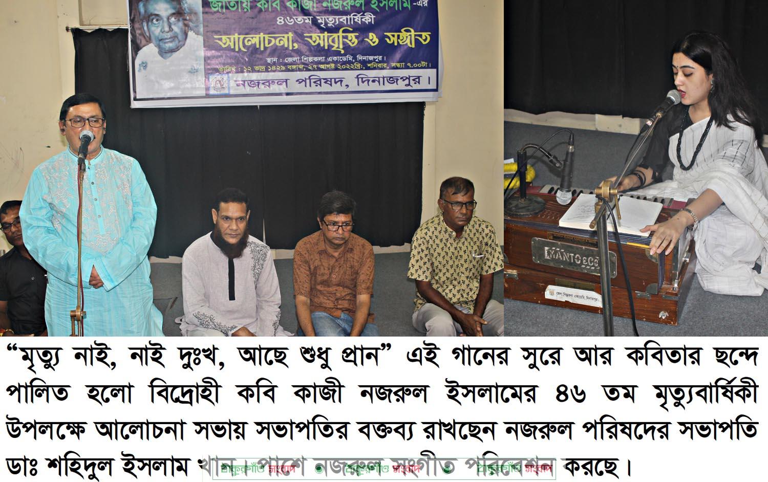 শনিবার রাতে জেলা শিল্পকলা একাডেমীর স্টুডিও হলরুমে নজরুল পরিষদ দিনাজপুর এর আয়োজনে কাজী নজরুল ইসলামের মৃত্যুবার্ষিকী পালন উপলক্ষ্যে আলোচনা সভা কবিতা আবৃত্তি ও নজরুল পরিষদের শিল্পীদের পরিবেশনায় নজরুল সংগীতানুষ্ঠান অনুষ্ঠিত হয়। নজরুল পরিষদ দিনাজপুর এর সভাপতি বিশিষ্ট চক্ষু বিশেষজ্ঞ সার্জন বীর মুক্তিযোদ্ধা ডাঃ শহিদুল ইসলাম খানের সভাপতিত্বে স্বাগত বক্তব্য রাখেন নজরুল পরিষদের সাধারন সম্পাদক নিজাম উদ্দীন আহমেদ রয়েল। মূখ্য আলোচ্যক হিসেবে কাজী নজরুল ইসলামের কর্মময় জীবন তুলে আলোচনা করেন বিশিষ্ট কবি-সাহিত্যিক, গবেষক ও বীরগঞ্জ সরকারি ডিগ্রি কলেজের অধ্যক্ষ ড. মাসুদুল হক ও সম্মিলিত সাংস্কৃতিক জোট দিনাজপুরের সভাপতি সুলতান কামালউদ্দীন বাচ্চু। সঞ্চালকের দায়িত্ব পালন করেন নজরুল পরিষদের প্রচার সম্পাদক প্রদীপ ঘোষ। দ্বিতীয় পর্বে সাবিনা ইয়াসমিন ইতির সঞ্চালনায় নজরুল সংগীত পরিবেশন করেন ডাঃ শহিদুল ইসলাম খান, নিজামুদ্দিন আহম্মেদ রয়েল, হাসান শাহ, লক্ষী কান্ত রায়, শামীম আরা, শিমুল রানী কর্মকার, সুজন কুমার দে, পম্পি সরকার, রায়েসা তাসরিন ও নজরুল ইসলাম নাজু। কবিতা আবৃত্তি করেন মোঃ ইরফান আলী, জাকির হোসেন। আলোচনা সভায় বক্তারা বলেন, নজরুল ইসলামের গান, কবিতা ও সাহিত্য কর্ম আদর্শ আমাদের ধারণ করতে হবে। অসম্প্রদায়িক বাংলাদেশ গড়তে এ সময় কাজী নজরুল ইসলামের গান-কবিতা যথেষ্ট ভ‚মিকা রাখবে। জাতির পিতা শেখ মুজিবুর রহমান কাজী নজরুল ইসলামকে যথেষ্ট শ্রদ্ধা করতেন বলেই তিনি বাংলাদেশে এসে সর্বপ্রথম নজরুল ইসলামকে কোলকাতা থেকে বাংলাদেশে আনেন। কবি কাজী নজরুল ইসলাম আজীবন সাম্প্রদায়িক ও স¤্রাজ্যবাদের বিরুদ্ধে লিখে গেছেন।