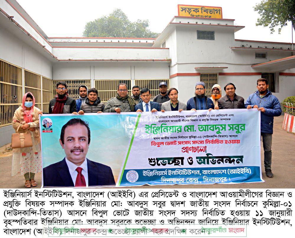 ইঞ্জিনিয়ার্স ইনস্টিটিউশন, বাংলাদেশ (আইইবি) এর প্রেসিডেন্ট ও বাংলাদেশ আওয়ামীলীগের বিজ্ঞান ও প্রযুক্তি বিষয়ক সম্পাদক ইঞ্জিনিয়ার মো: আবদুস সবুর দ্বাদশ জাতীয় সংসদ নির্বাচনে কুমিল্লা-০১ (দাউদকান্দি-তিতাস) আসনে বিপুল ভোটে জাতীয় সংসদ সদস্য নির্বাচিত হওয়ায় ইঞ্জিনিয়ার মো: আবদুস সবুরকে শুভেচ্ছা ও অভিনন্দন জানিয়ে ইঞ্জিনিয়ার ইনস্টিটিউশন, বাংলাদেশ (আইইবি) দিনাজপুর কেন্দ্র শুভেচ্ছা র্যালী শহর প্রদক্ষিণ করেন।