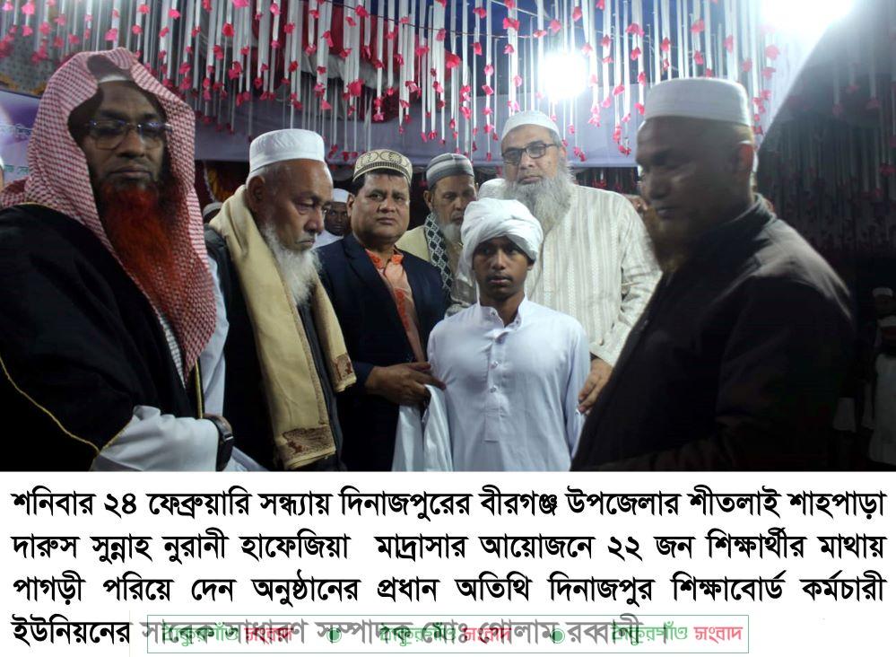 ২৪ ফেব্রæয়ারি সন্ধ্যায় মাদ্রসার শিক্ষার্থীদের মাথায় পাগড়ী পরিয়ে দেন অনুষ্ঠানের প্রধান অতিথি দিনাজপুর শিক্ষাবোর্ড কর্মচারী ইউনিয়নের সাবেক সাধারণ সম্পাদক মোঃ গোলাম রব্বানী ।